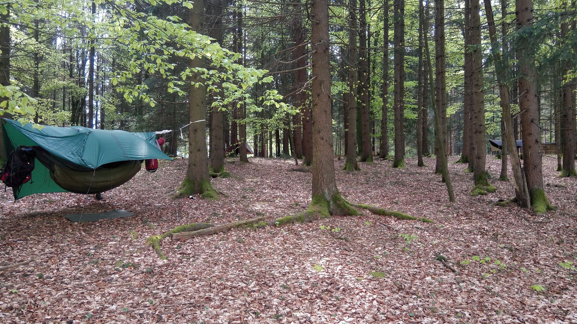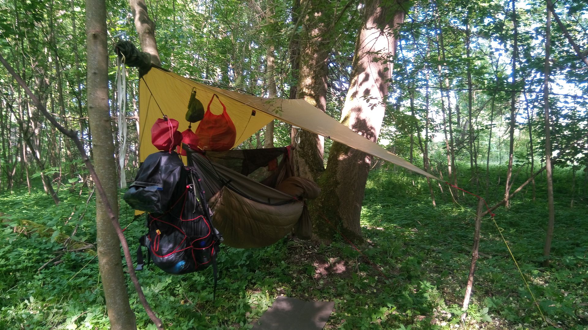 Ich persönlich befestige meinen Rucksack immer mit einen Karabiner an der Hängematte. Der hängt dann gerade noch so mit unterm Tarp .