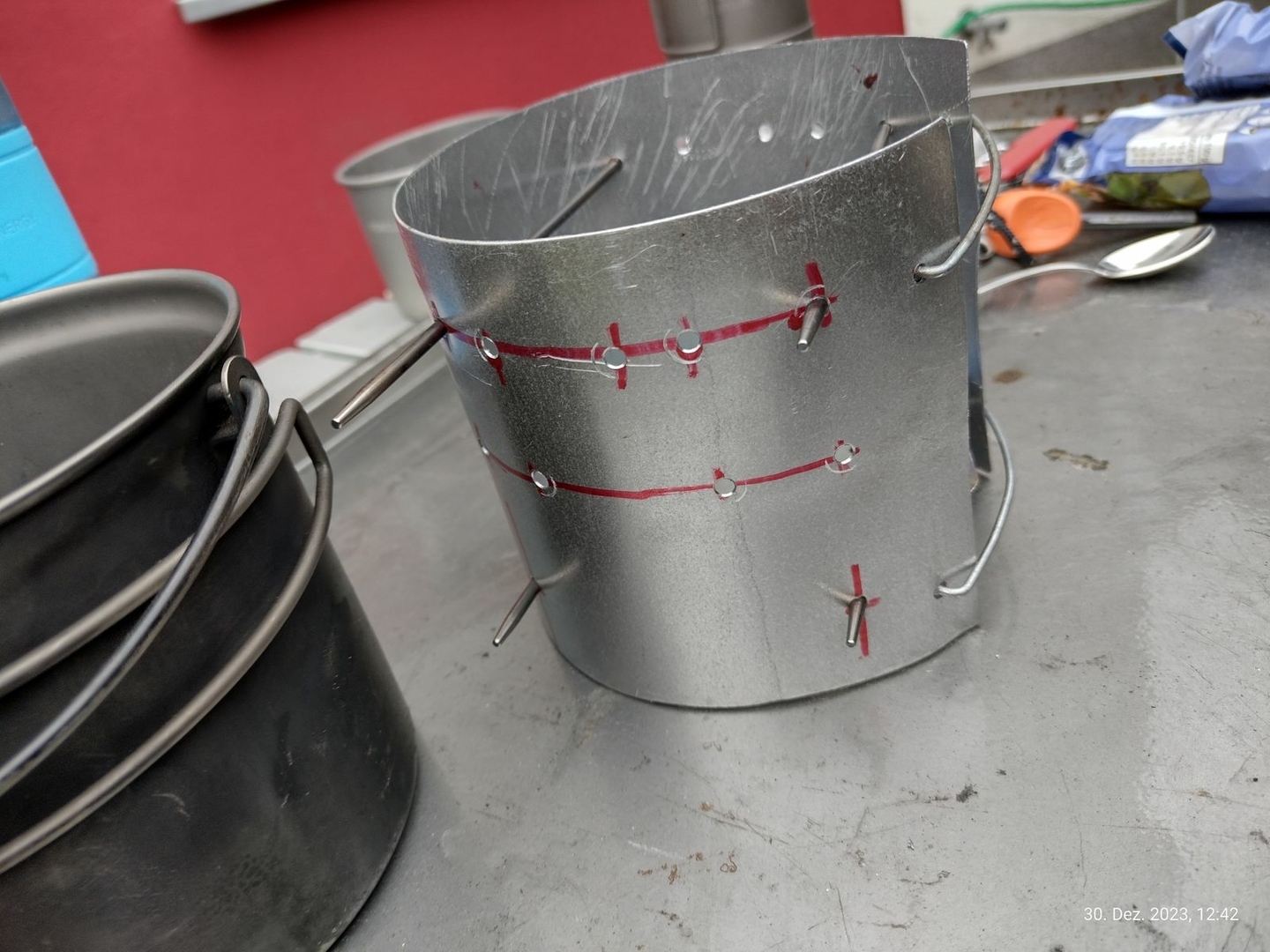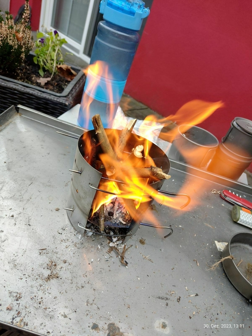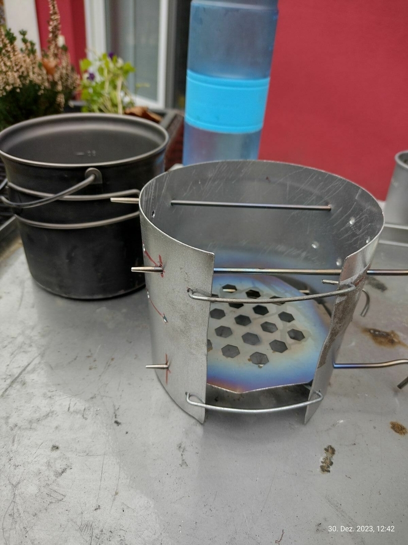 Da nach dem Mittagessen Caffee quasi Ritual oder Pflicht ist, wurde jetzt der Betrieb mit dem Toaks Spiritusbrenner getestet. Dazu die topftragenden Heringe eine Etage tiefer und Abfahrt.