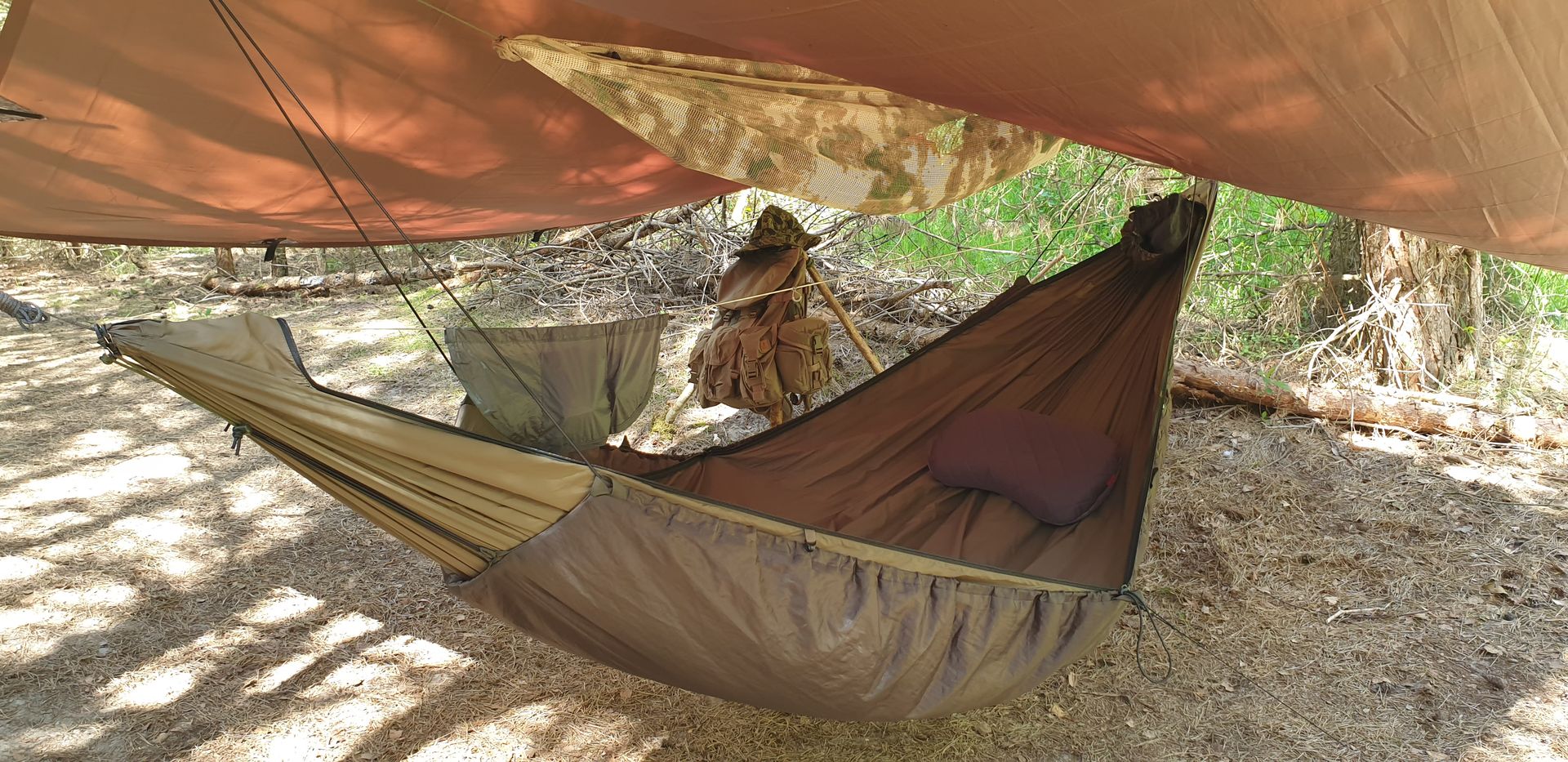 Ich falte die Enden an beiden seiten Zihermonikamässig zusammen, bringe zwei zugeschnittene Paracord Stücke mit nem Slipknot an und hänge das ganze an Karabiner direkt an die Tarp Ridgeline. Hatte bis jetzt noch nie probleme das es nicht hält bis 4-5 Kilo Gewicht. Über die Hängematte und nicht darunter wie gesagt. So brauche ich liegend nur hoch greifen wenn ich was brauche und ich sehe meinen Kram auch. Darunter ist nicht gut