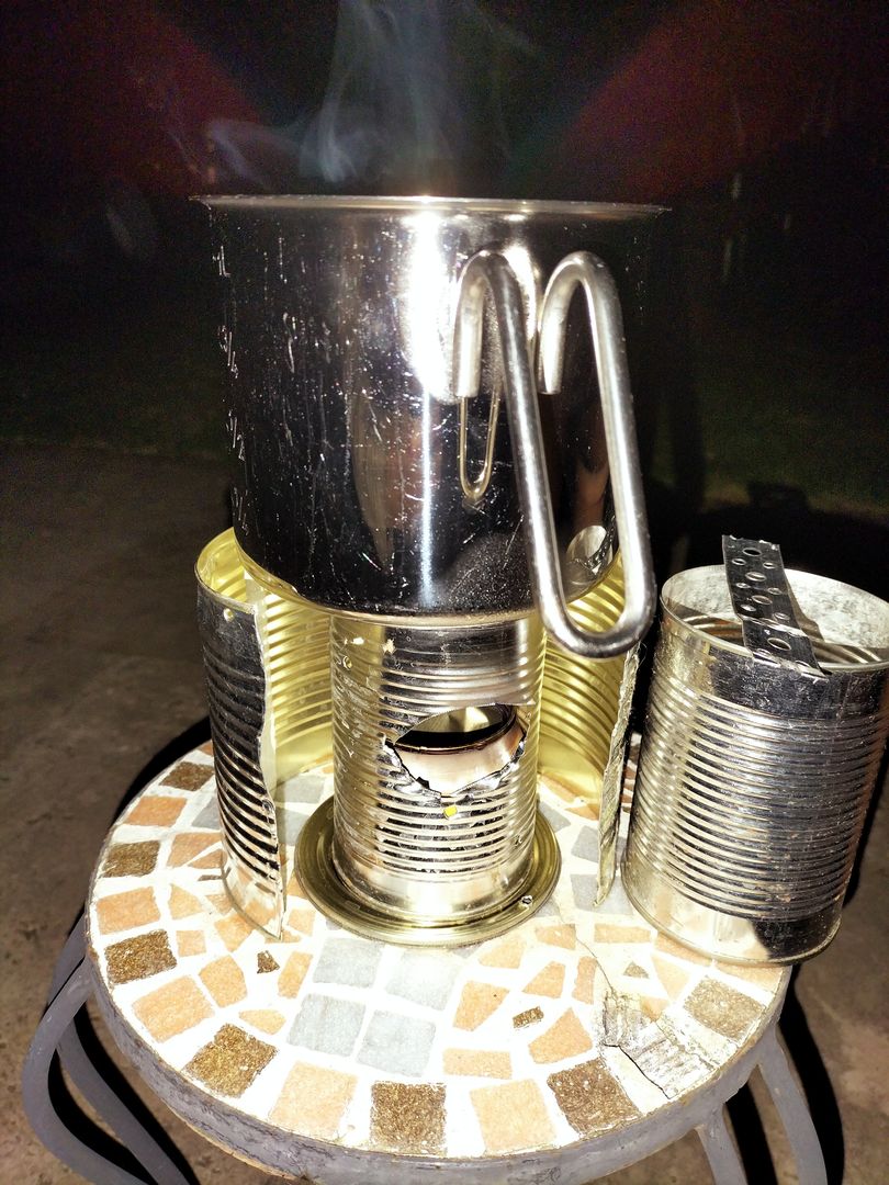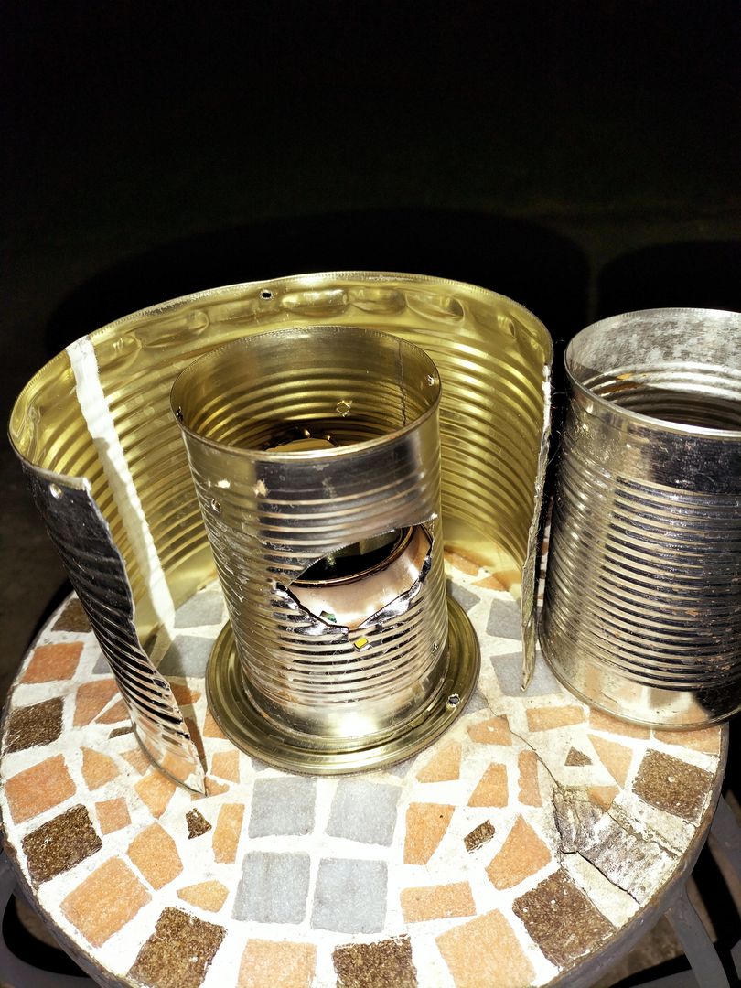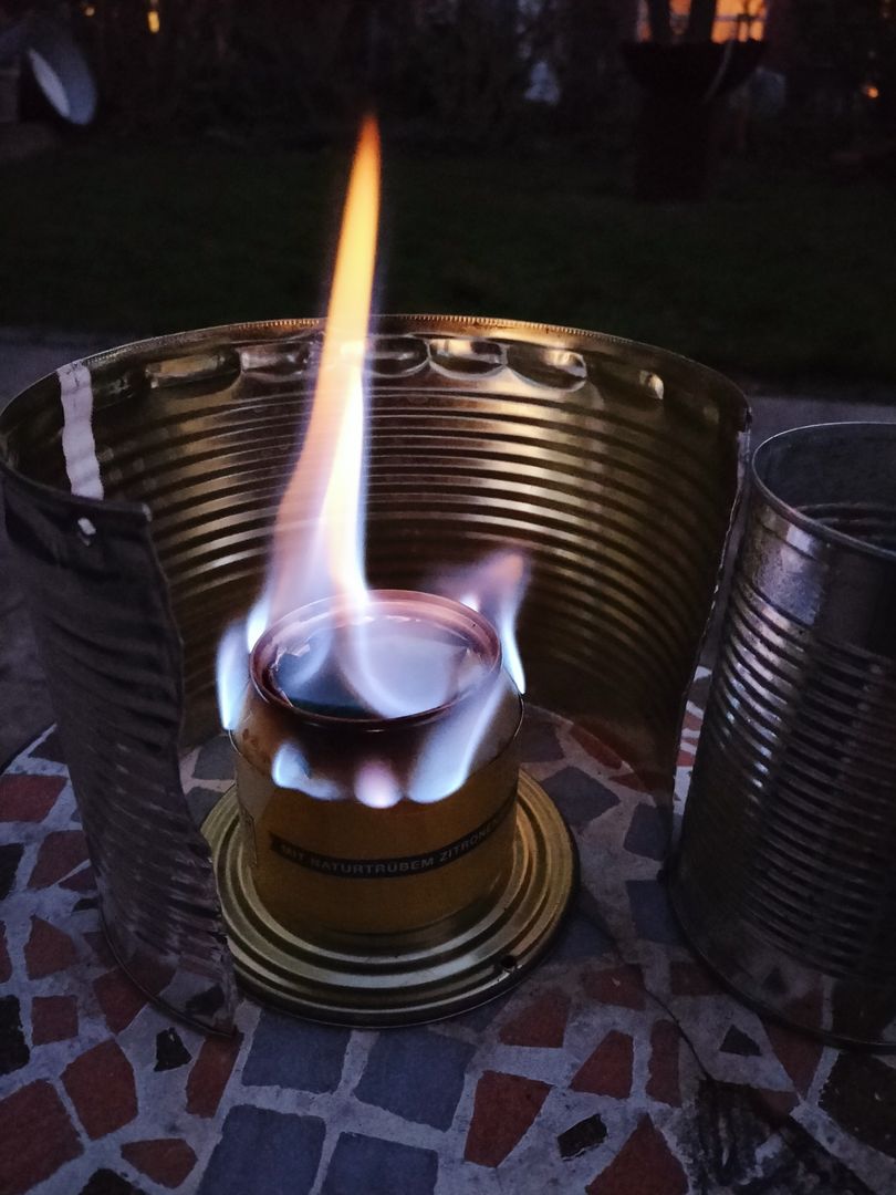 Habe heute meinen Dosenbrenner, den ich beim Wintertreffen gebaut habe (danke, lieber Jens), meiner Familie vorführen wollen. Da wir aber keinen Brennspiritus, sondern nur Sicherheitsbrennpaste hatten, die wohl mehr Sauerstoff braucht, um nicht zu ersticken, habe ich weiter raumgebastelt.