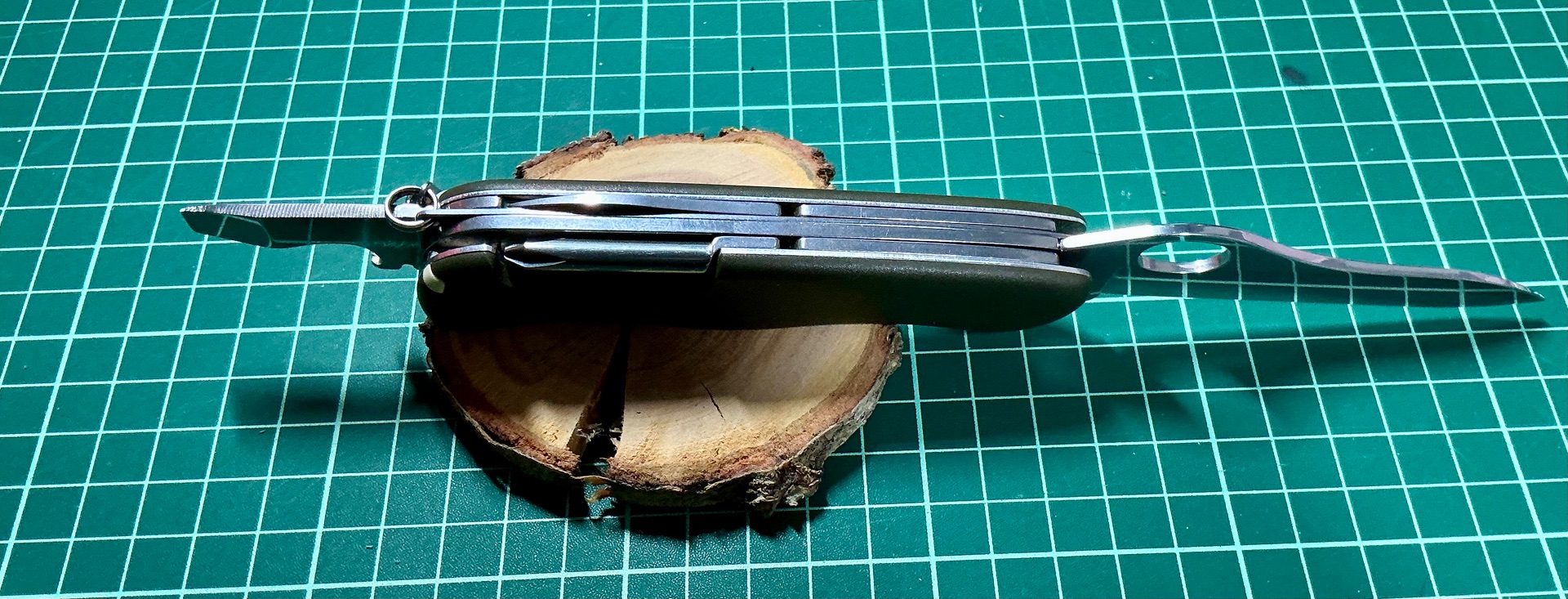).Da der große Schlitzschraubendreher genauso verriegelt wie die Klinge habe ich die Oberseite mit einer Feile bearbeitet und dient jetzt zuverlässig für den Feuerstahl.