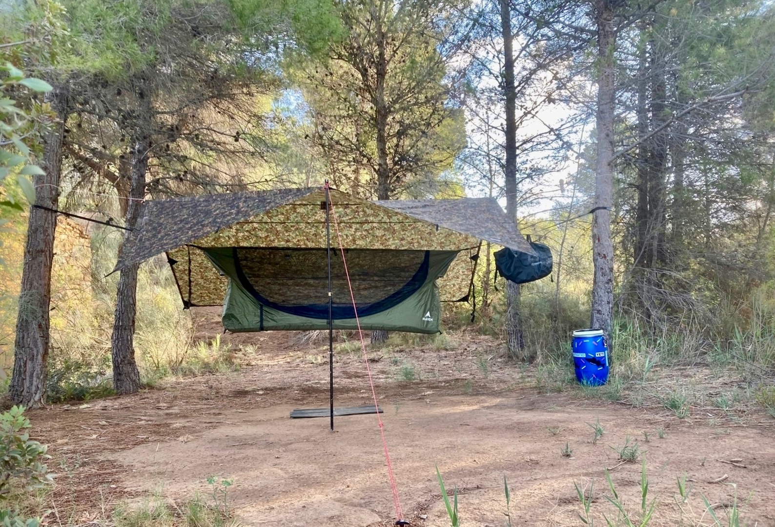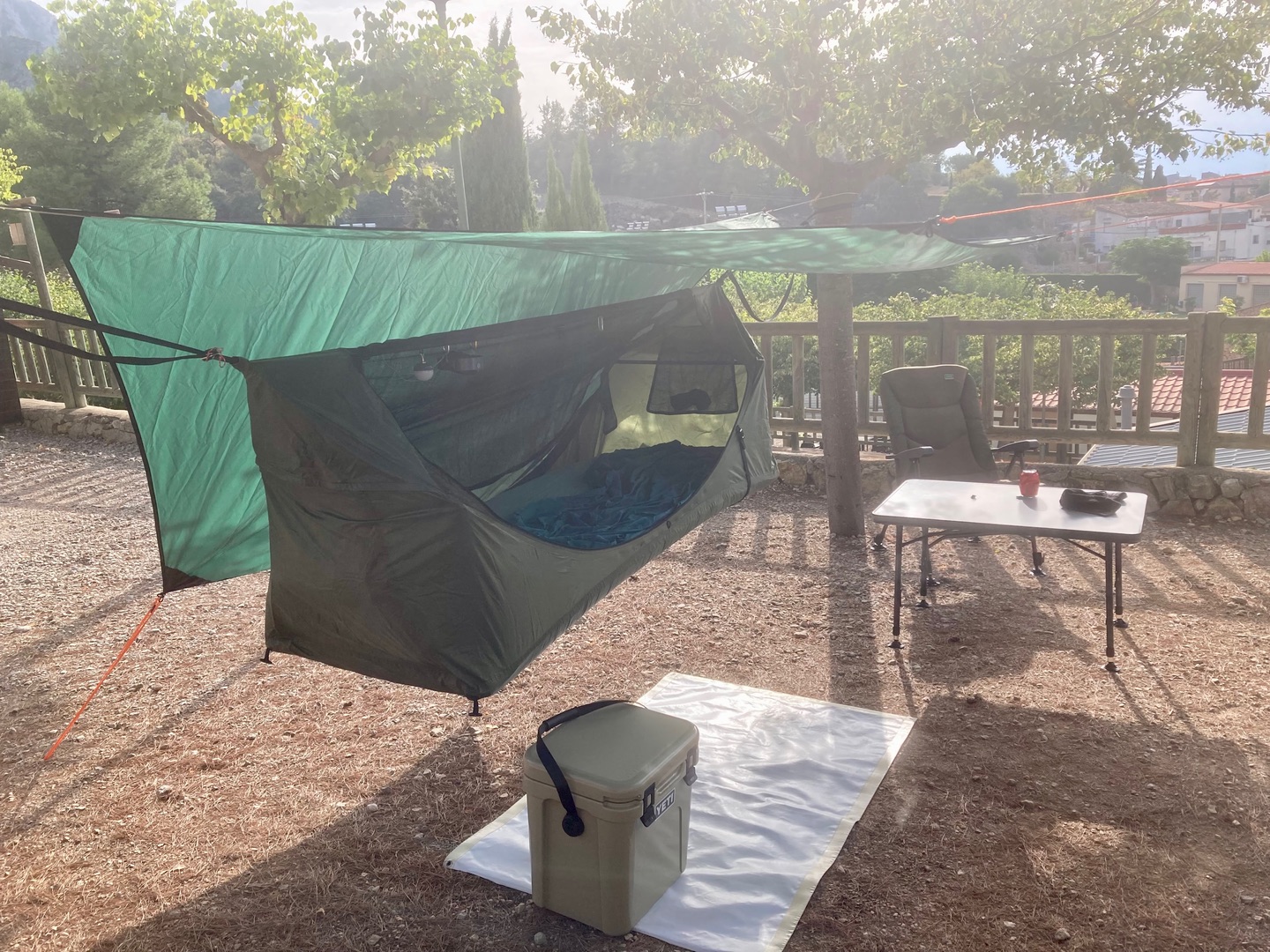 Ich spanne mir eine Ridgeline übers Haventent und darüber dann ein 3x3 Meter Tarp oder wie auf dem Foto das Hennessy Hexatarp . Allerdings dient ein Tarp bei mir eher als Sonnenschutz und weniger als Regenschutz.