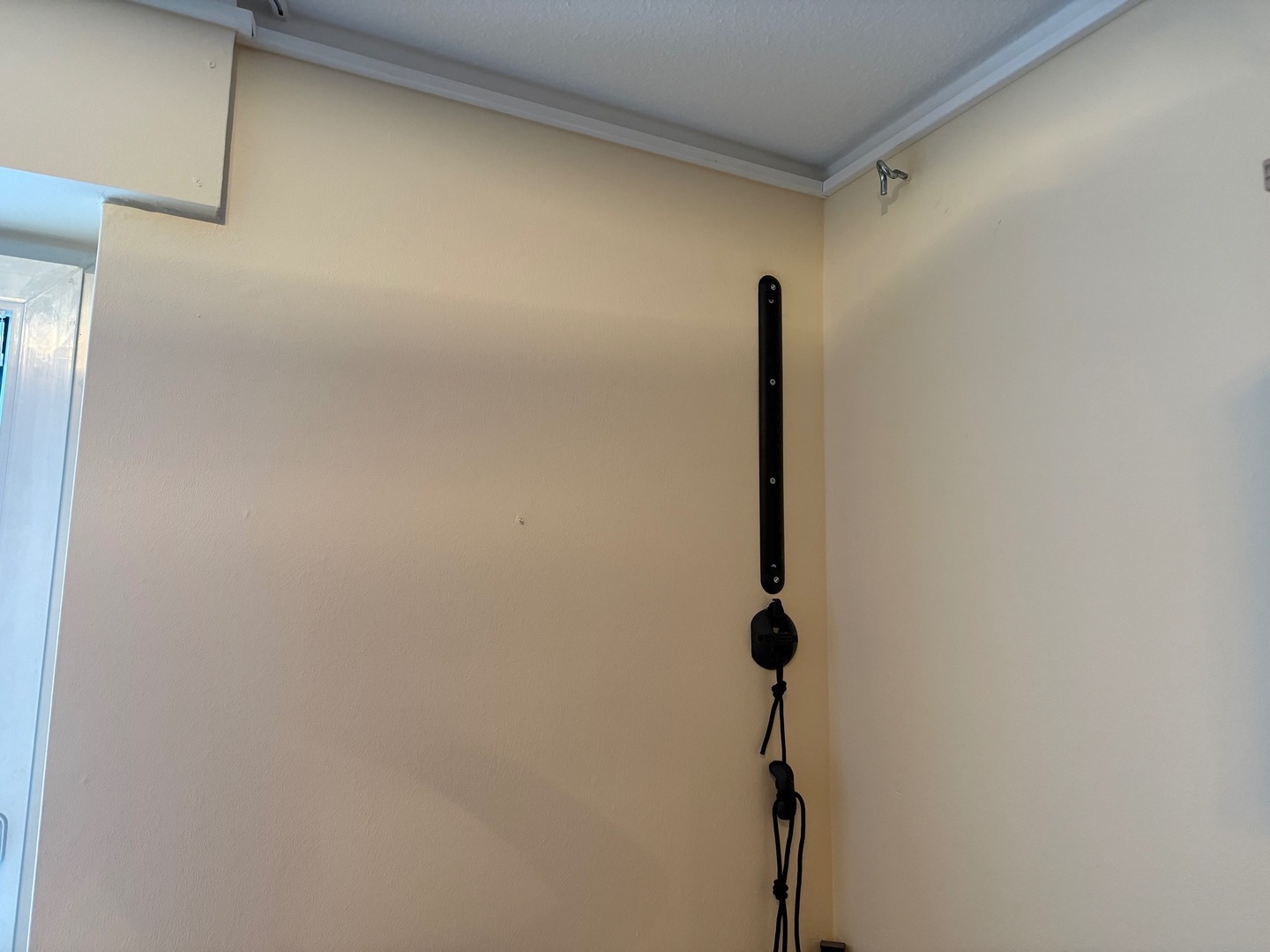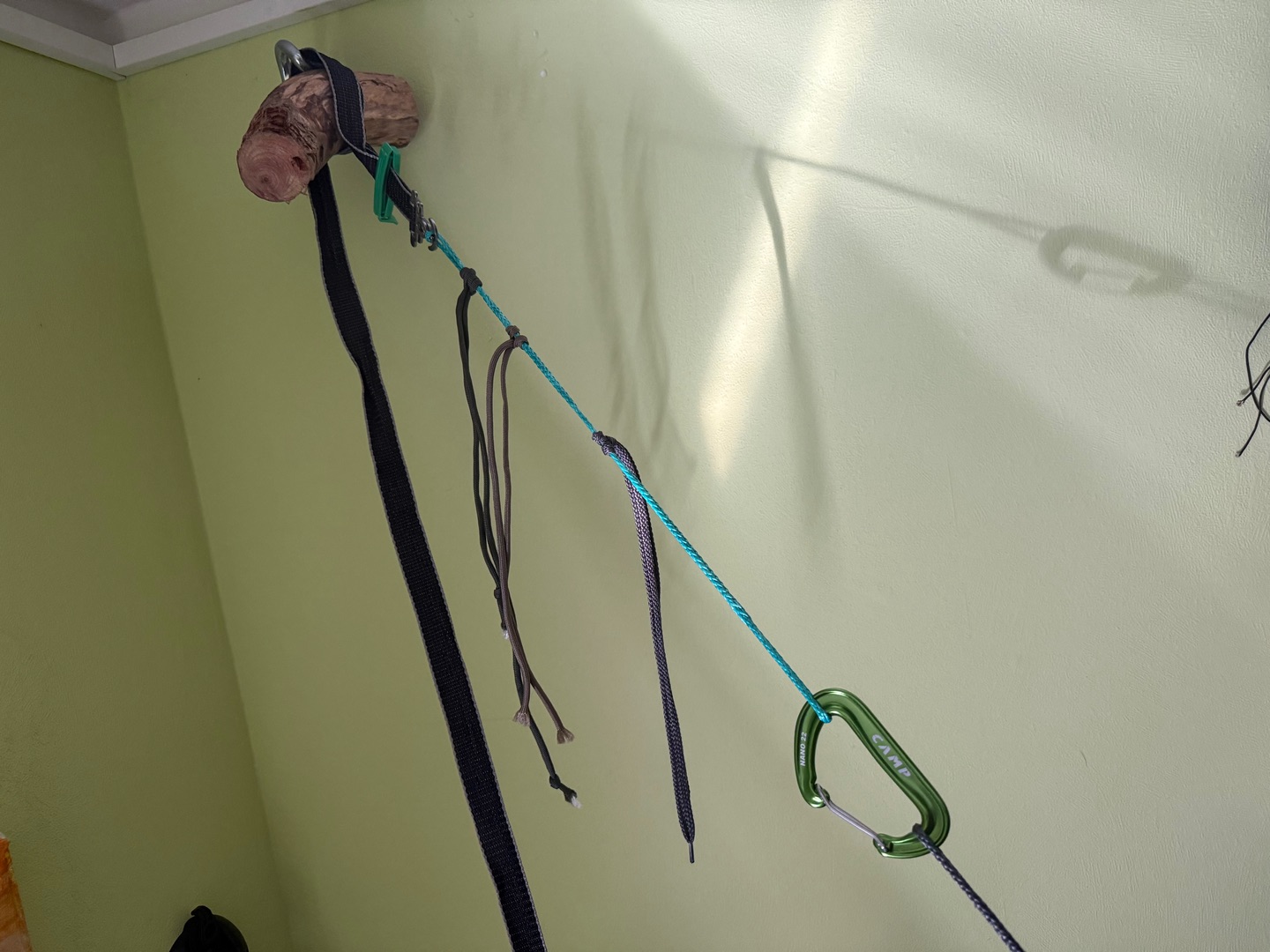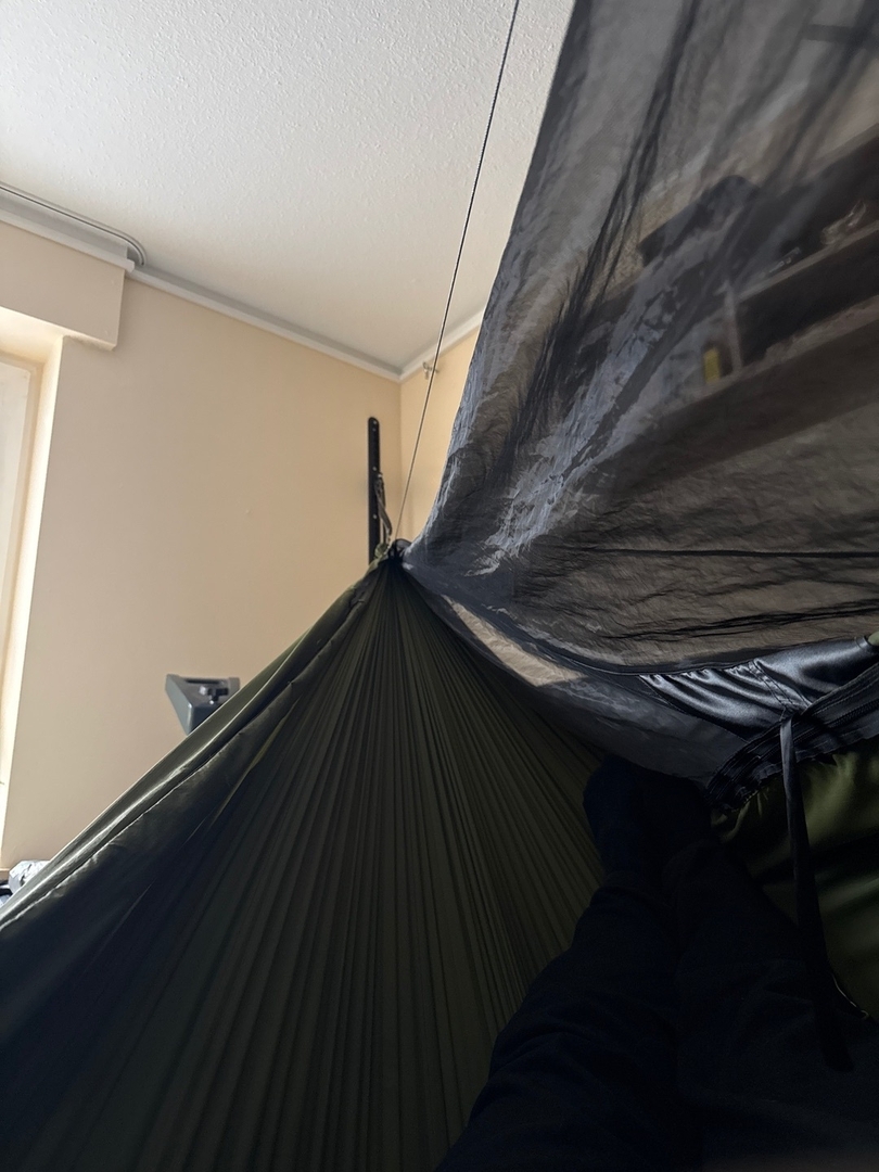 an dem Haken oben an der Wand hing das Fußteil vorher. Das war aber etwas zu steil vom Winkel. Trotzdem reichte es für eine gute Nacht.