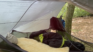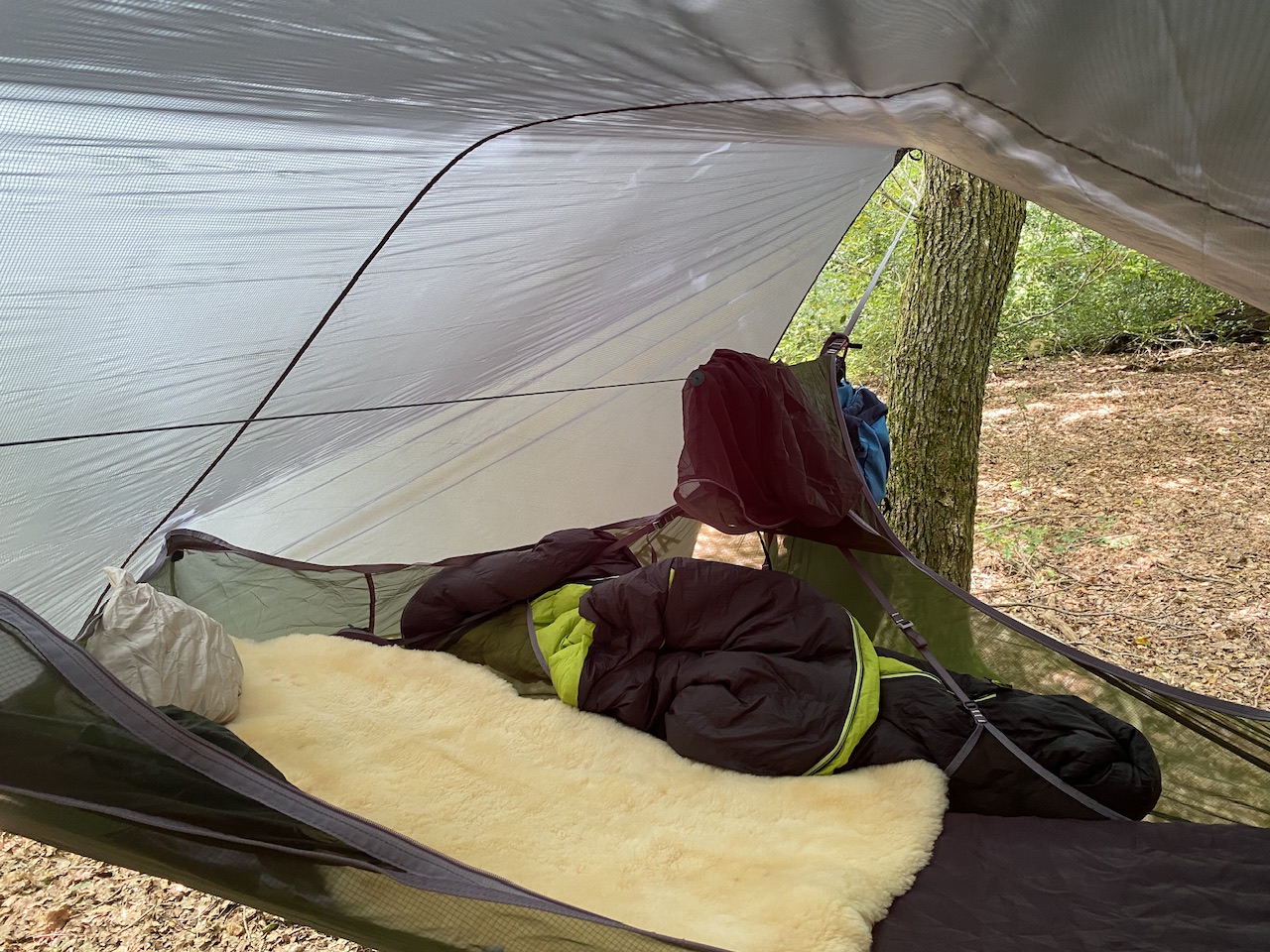 Ich muss zugeben, das ich etwas „pimpen“ musste, um nicht zu frieren. Die ISO Matte mit R Wert 3,5 war zu kalt. Mit Faltisomatte, Fell und Wolldecke blieb dann auch der Popo warm.