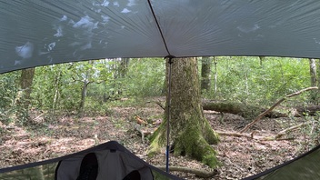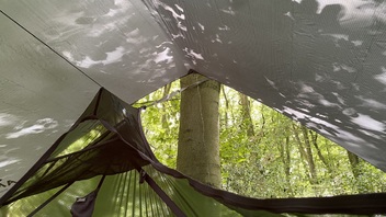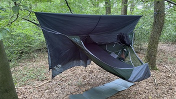 Die Hauptschwierigkeit war es, ein Tarp zu finden, dass "gedreht" ist, also als Beispiel: nicht 4x3m sondern 3x4m. Dabei sollte es noch leicht sein und am liebsten in camo Farben. Am Kopfende war mir die Amazonas oft etwas zu knapp (3m Breite), aber es ging.