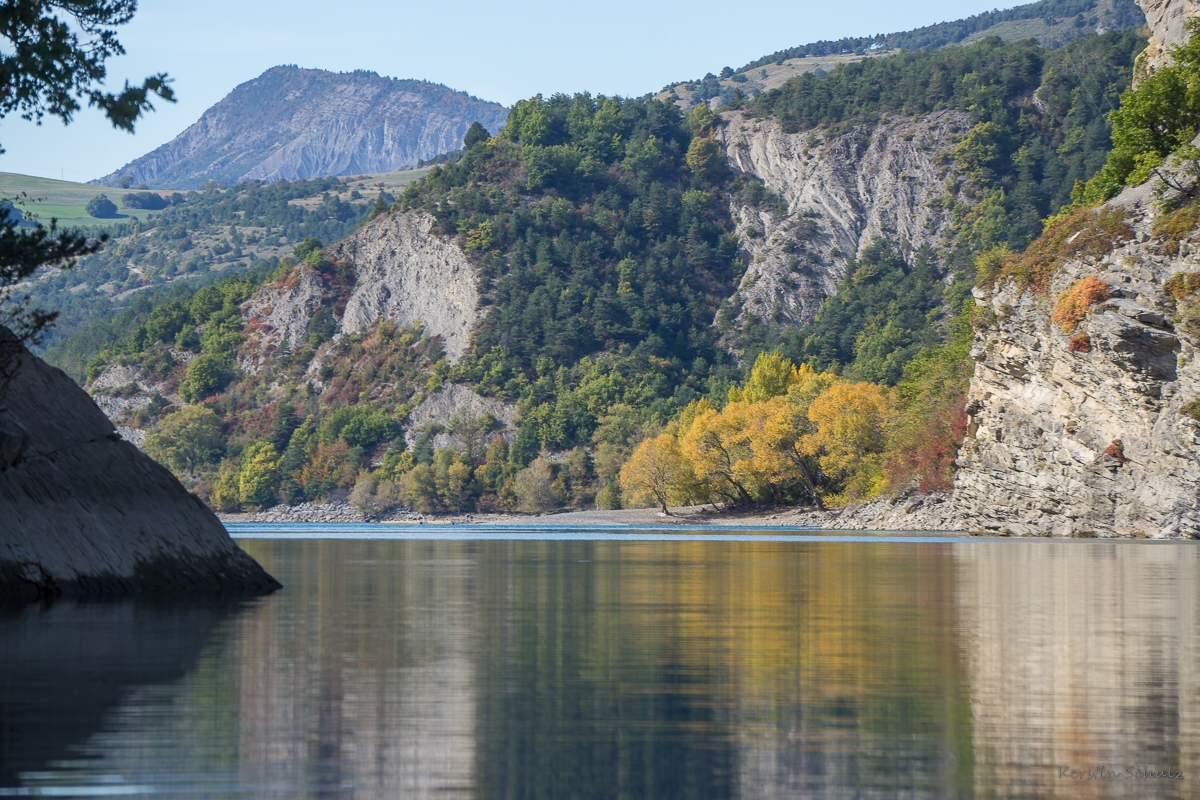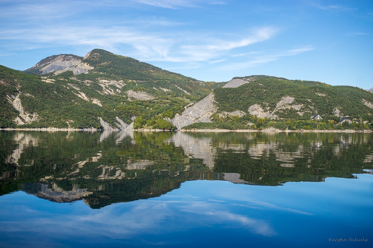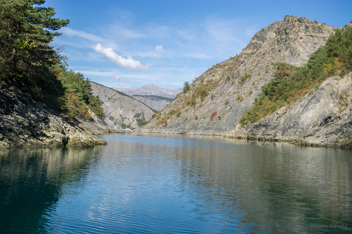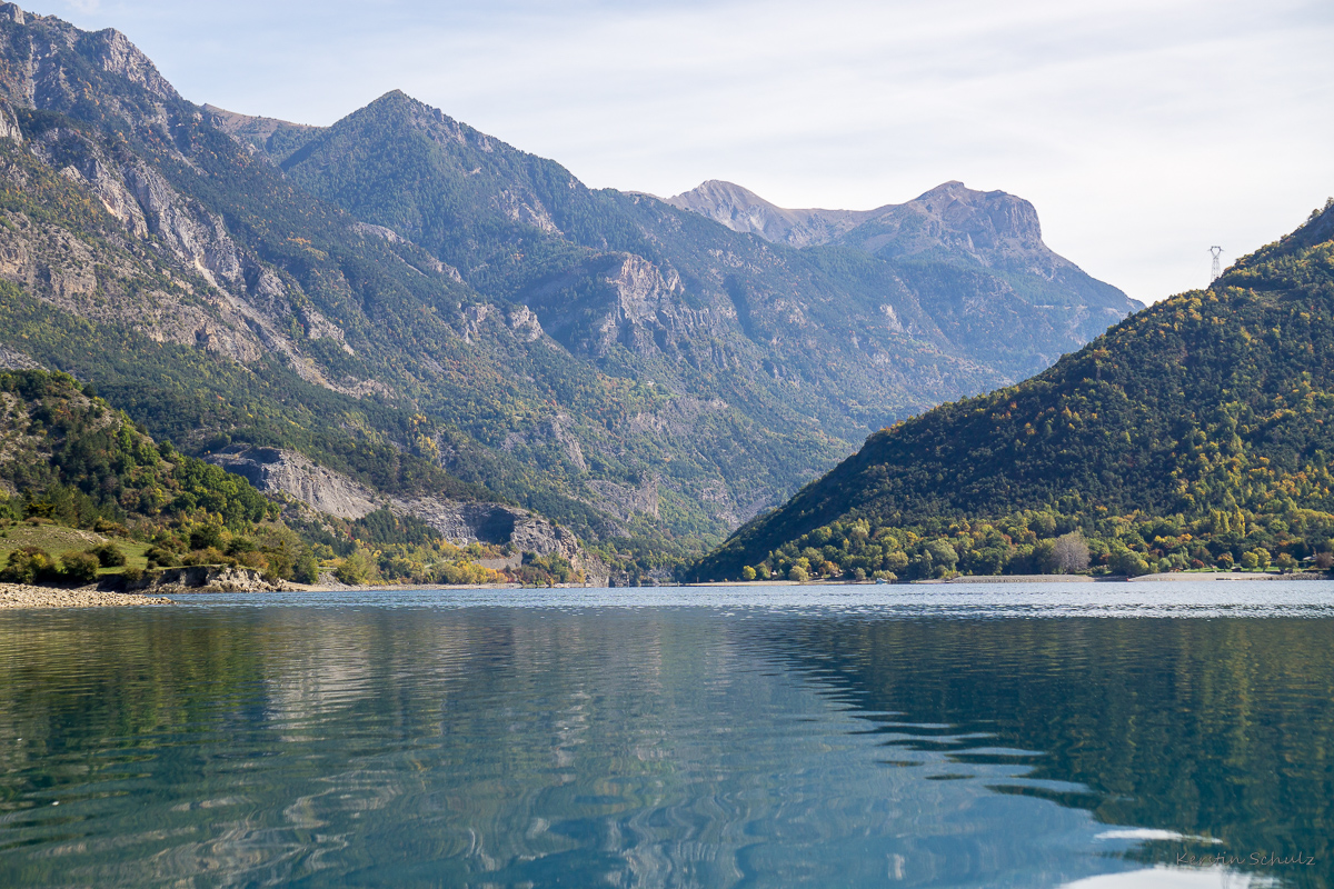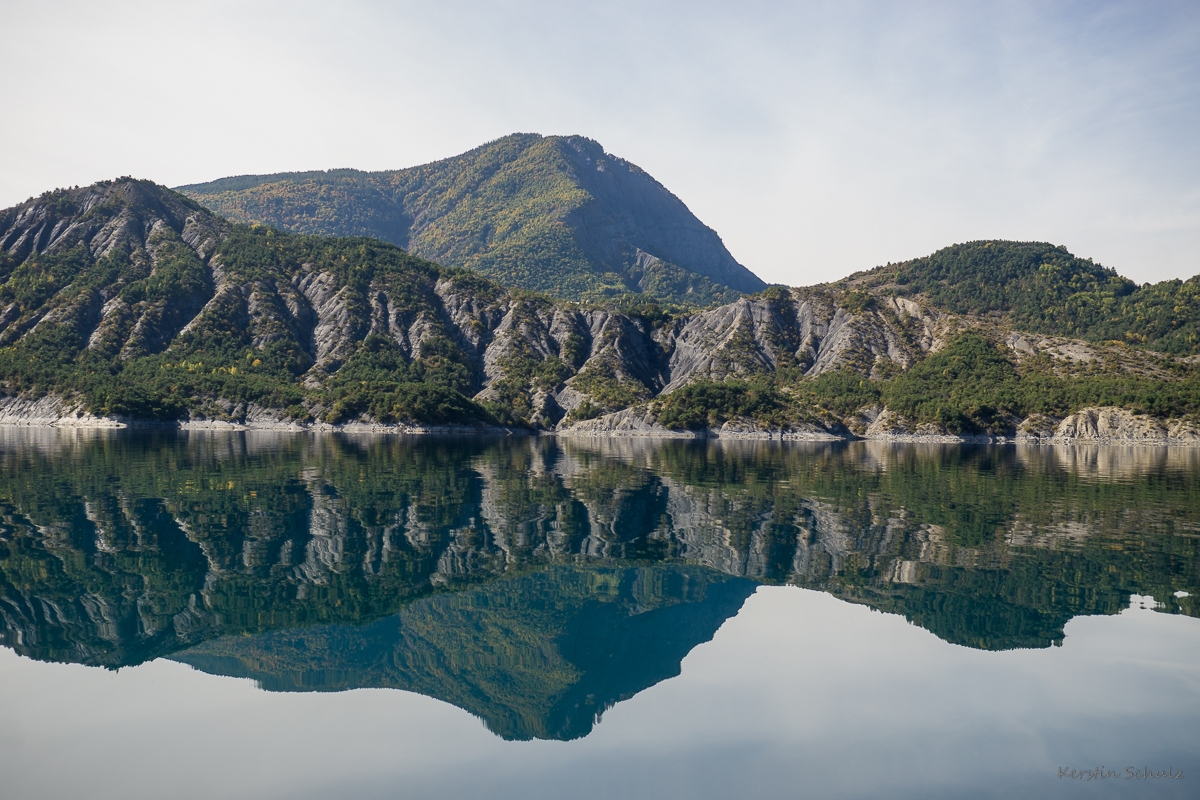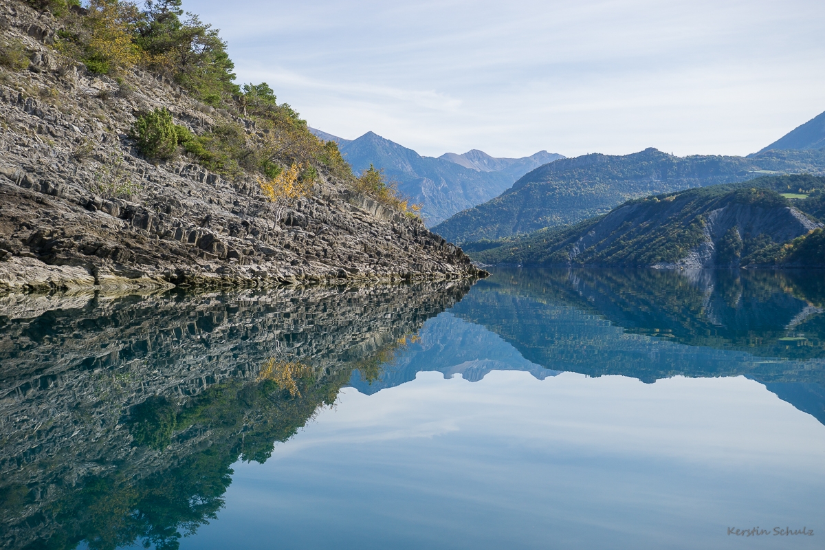 Nach etwa einer Stunde komme ich an den Zusammenfluss und ab jetzt fahre ich auf der Ubaye. Hier ist die Landschaft deutlich wilder und die laute Strasse verläuft hier auch nicht mehr. Teilweise ist es so windstill, dass der See völlig glatt wird und mir die Spiegelungen der Felsstrukturen im Wasser völlig den Kopf verdrehen. Fast wird mir schwindlig.