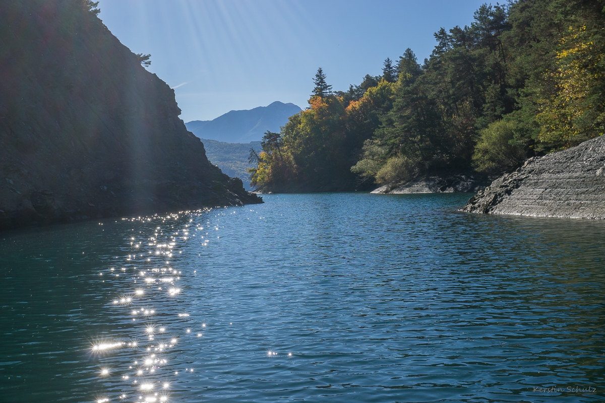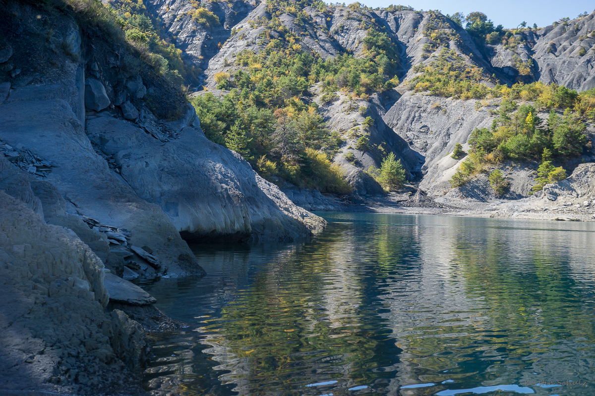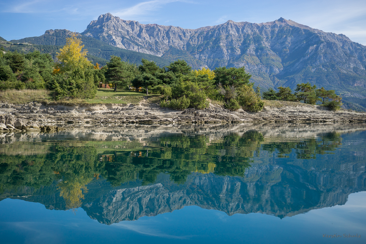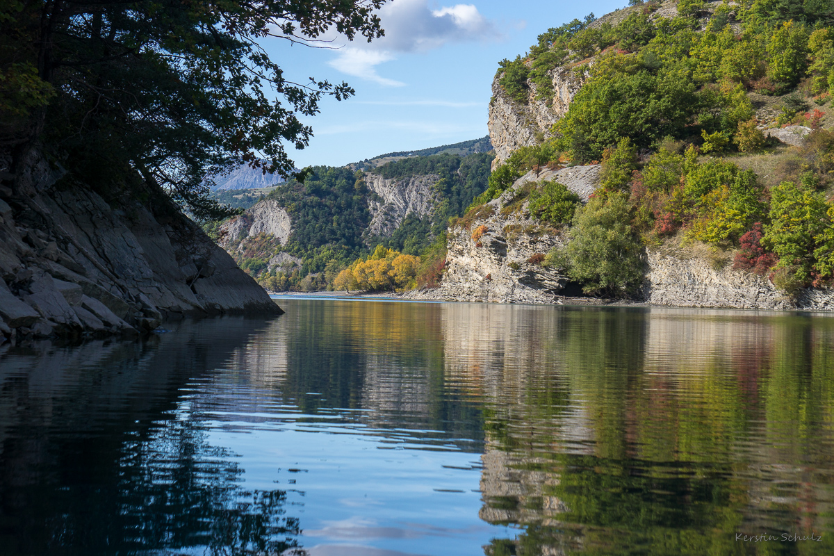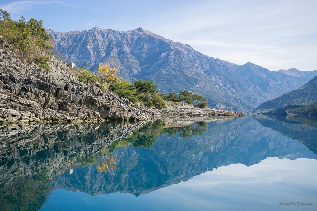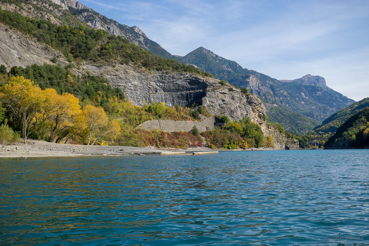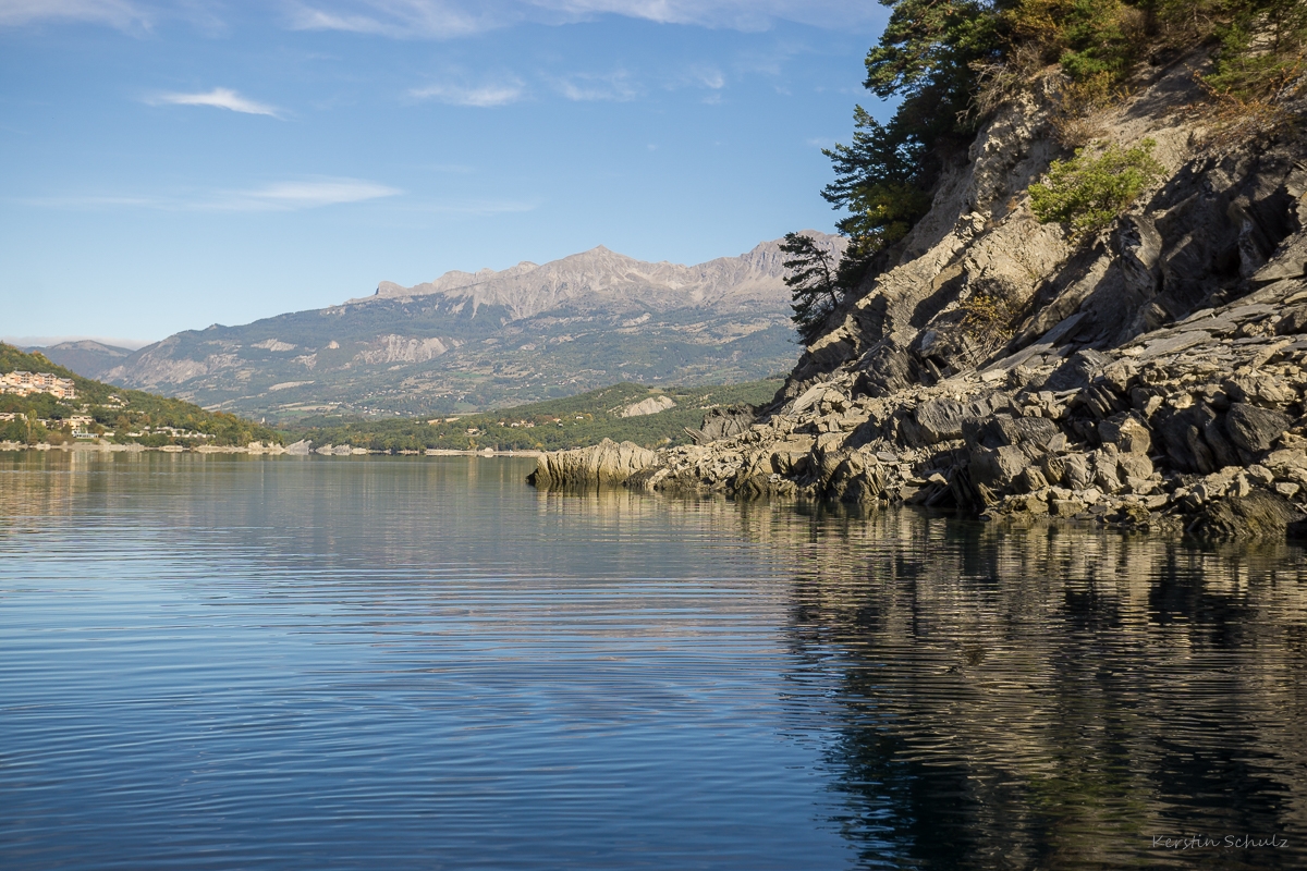 Nach etwa einer Stunde komme ich an den Zusammenfluss und ab jetzt fahre ich auf der Ubaye. Hier ist die Landschaft deutlich wilder und die laute Strasse verläuft hier auch nicht mehr. Teilweise ist es so windstill, dass der See völlig glatt wird und mir die Spiegelungen der Felsstrukturen im Wasser völlig den Kopf verdrehen. Fast wird mir schwindlig.
