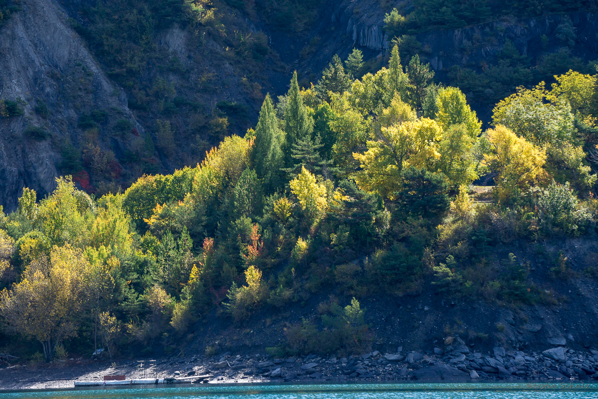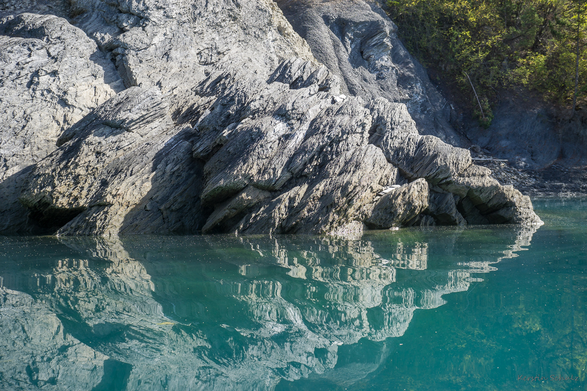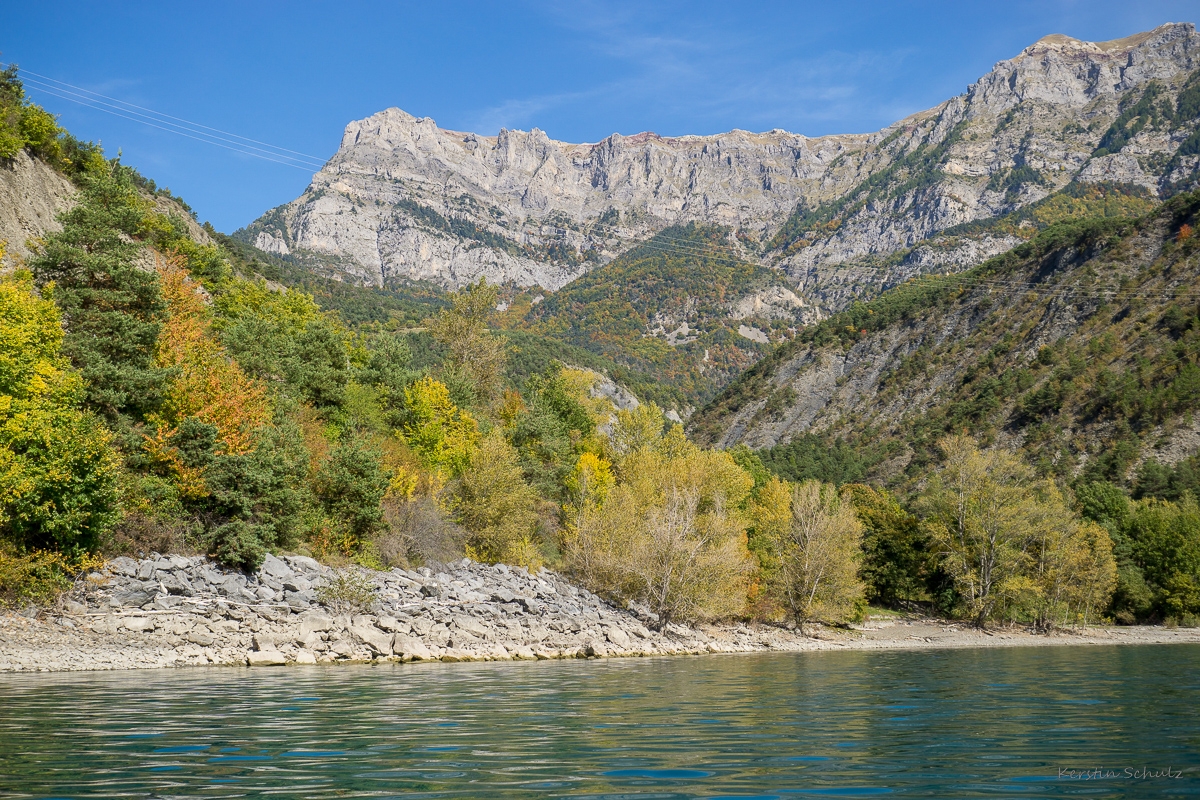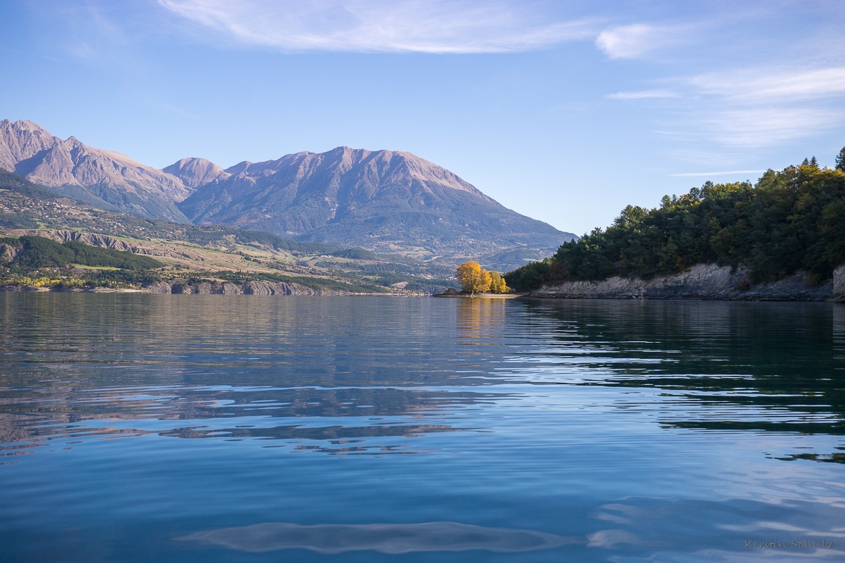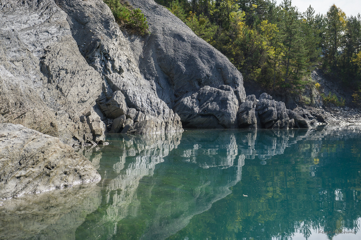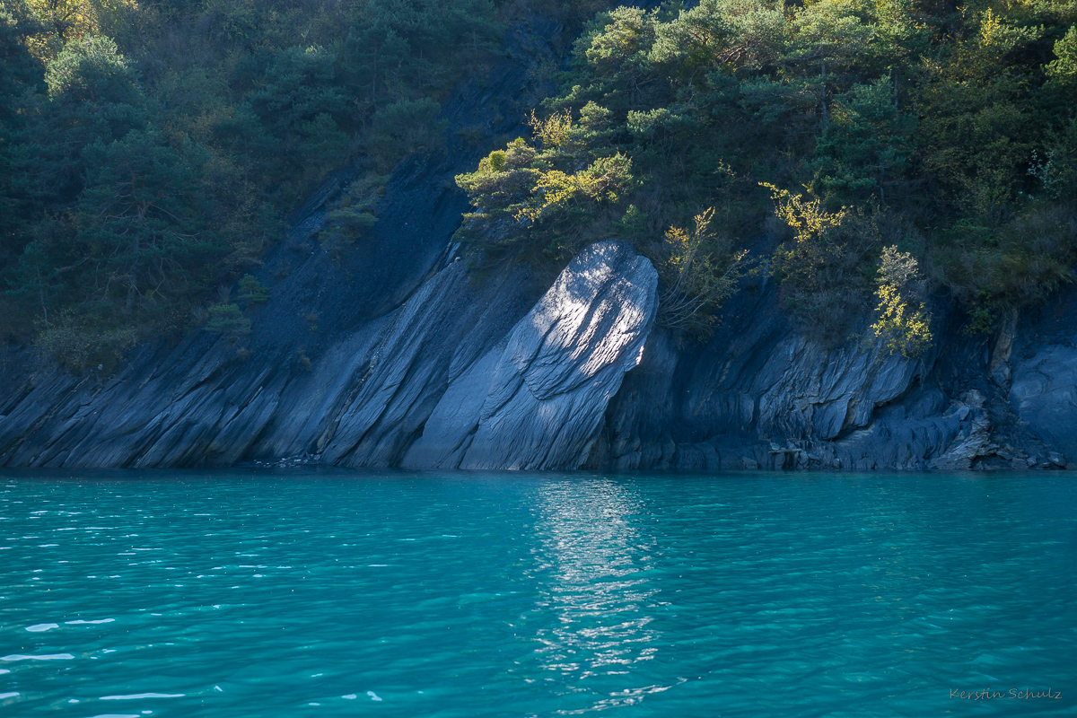 Nach etwa einer Stunde komme ich an den Zusammenfluss und ab jetzt fahre ich auf der Ubaye. Hier ist die Landschaft deutlich wilder und die laute Strasse verläuft hier auch nicht mehr. Teilweise ist es so windstill, dass der See völlig glatt wird und mir die Spiegelungen der Felsstrukturen im Wasser völlig den Kopf verdrehen. Fast wird mir schwindlig.