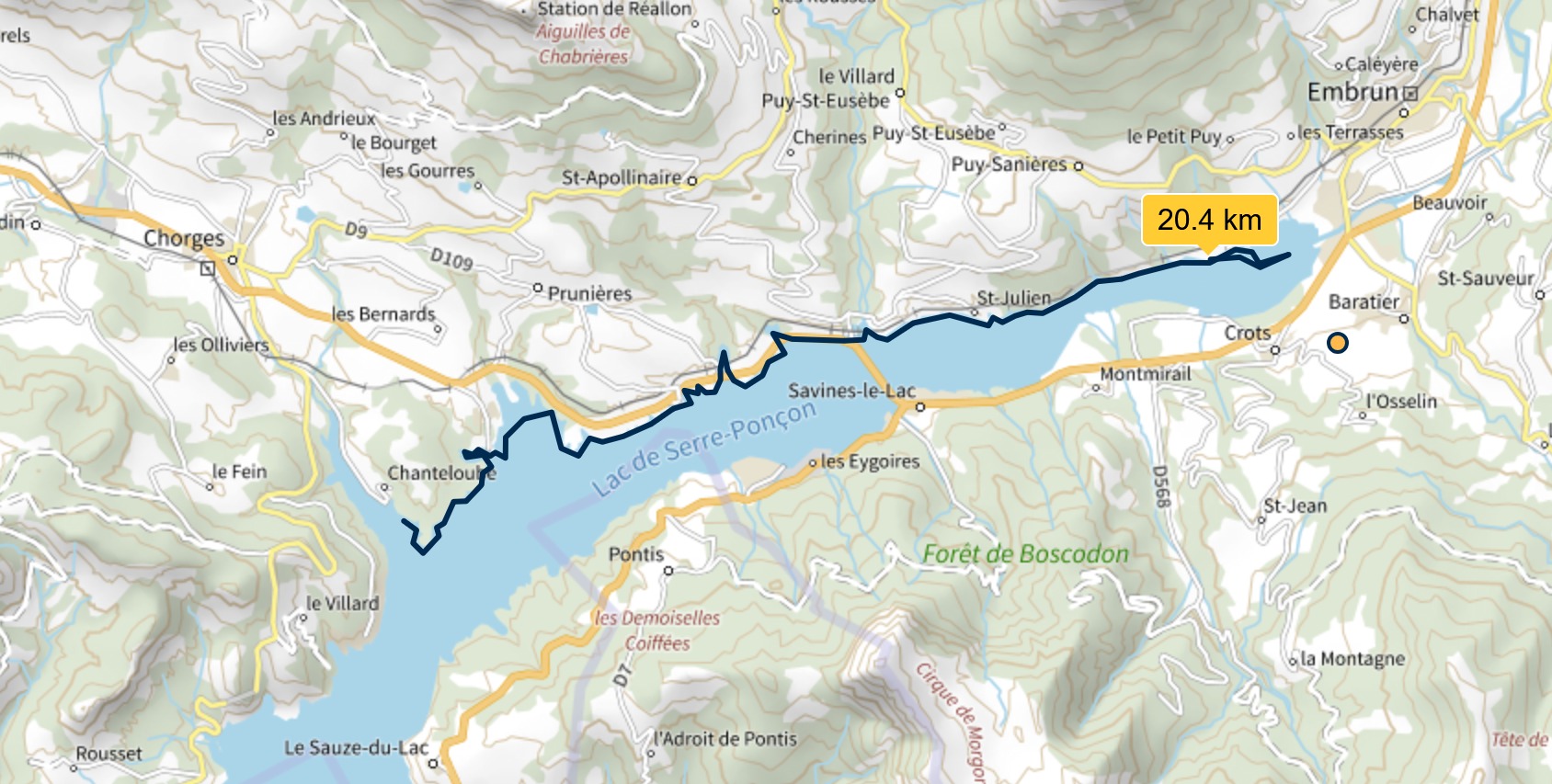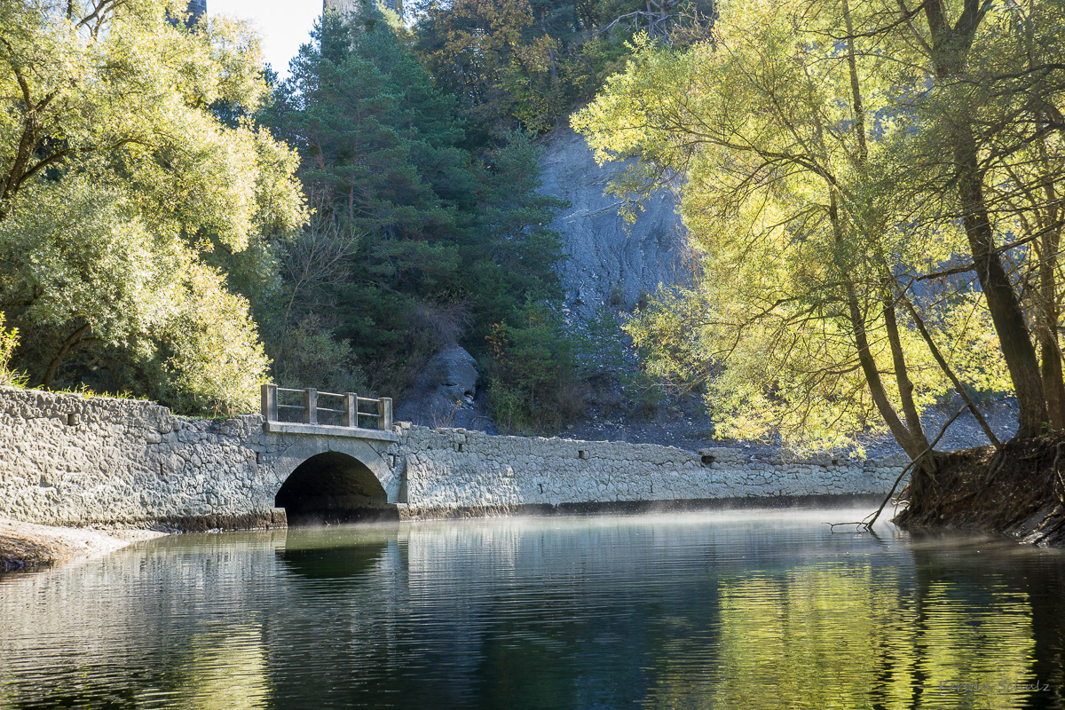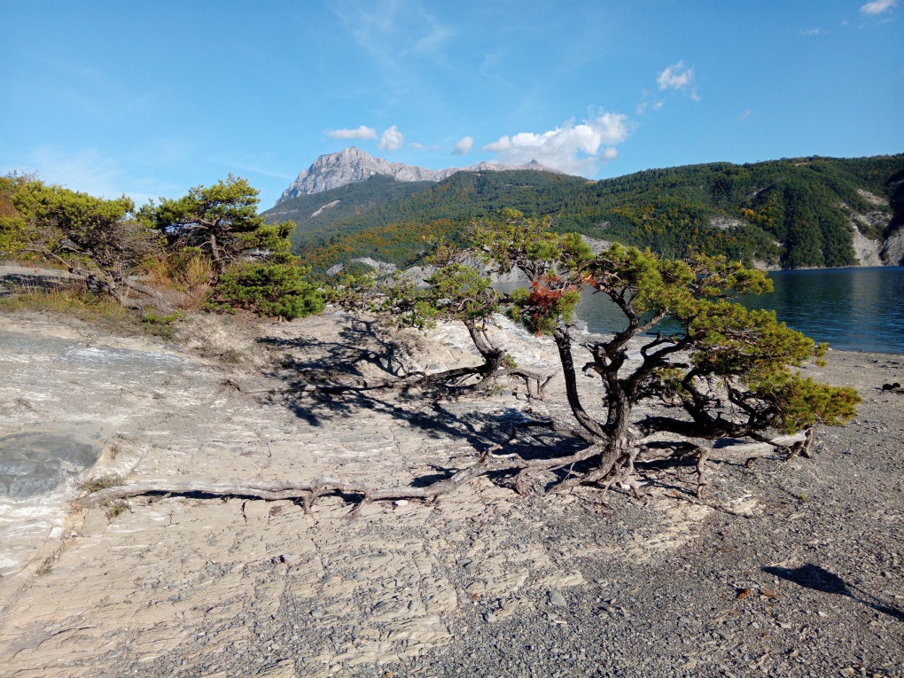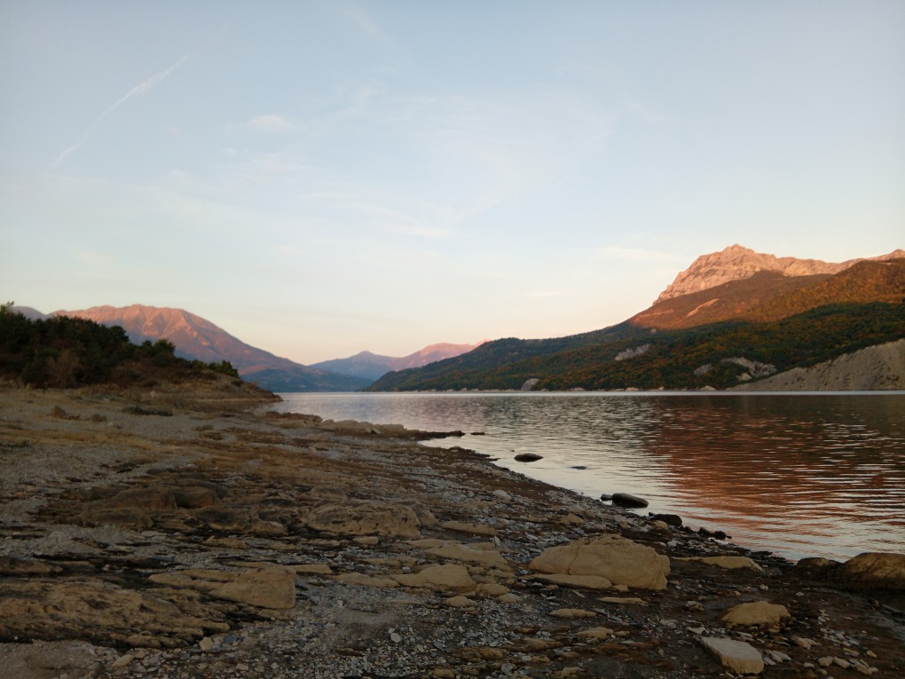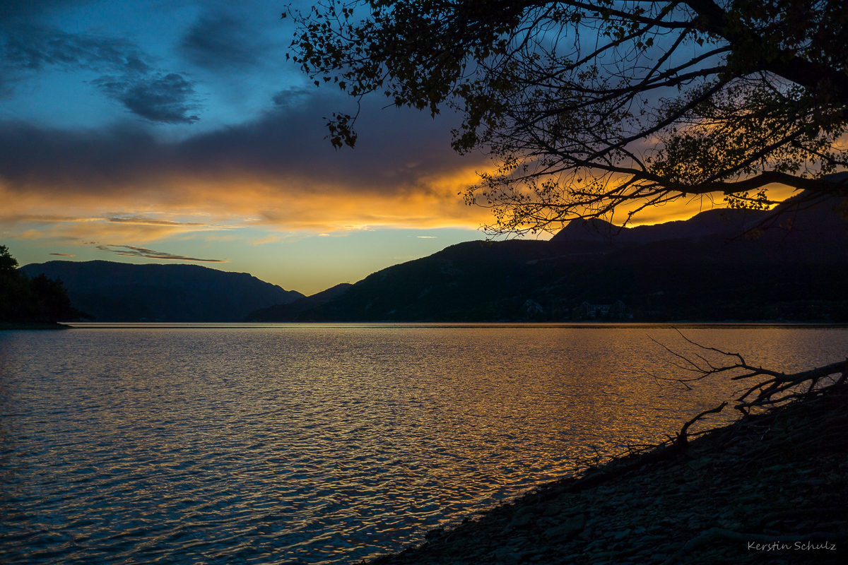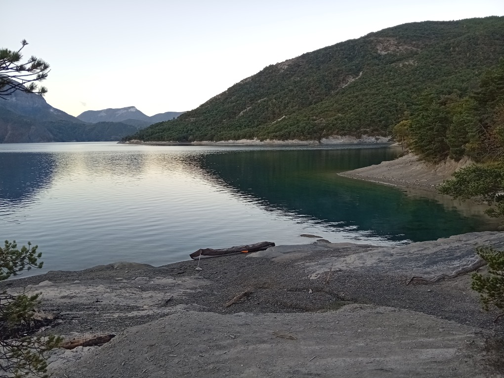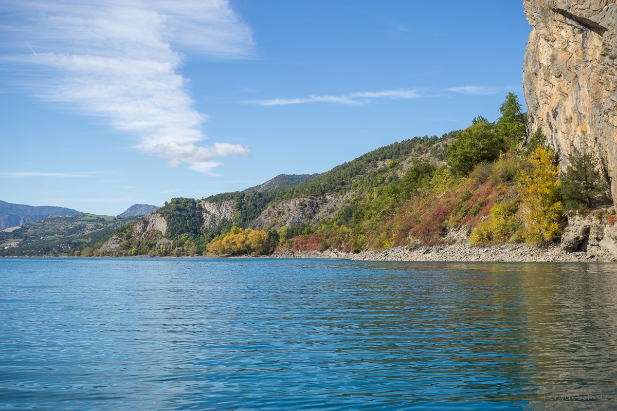 Nach etwa einer Stunde komme ich an den Zusammenfluss und ab jetzt fahre ich auf der Ubaye. Hier ist die Landschaft deutlich wilder und die laute Strasse verläuft hier auch nicht mehr. Teilweise ist es so windstill, dass der See völlig glatt wird und mir die Spiegelungen der Felsstrukturen im Wasser völlig den Kopf verdrehen. Fast wird mir schwindlig.