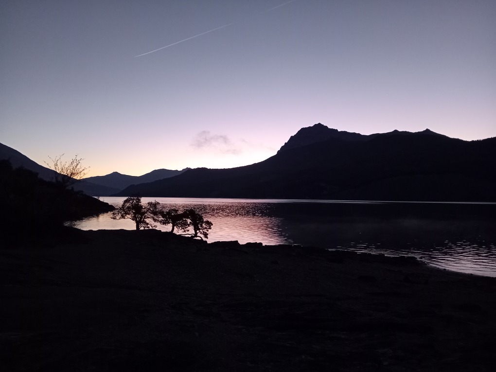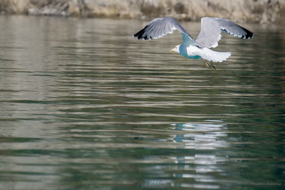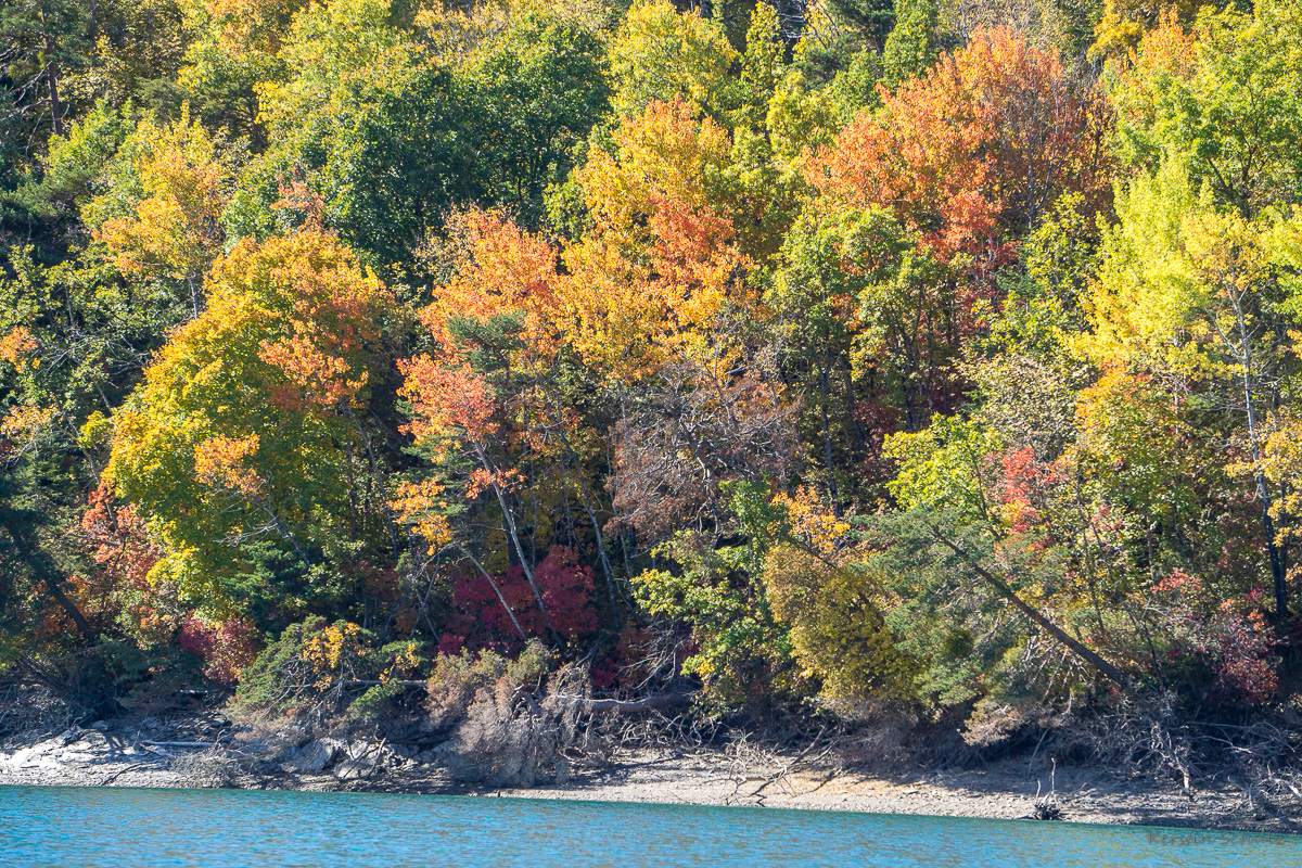 Ich war fast am Ende des Sees und habe nun ans andere Ufer gewechselt. Ab jetzt fahre ich nach Südwesten und bekomme am Nachmittag für ein paar Stunden ordentlichen Gegenwind. Das Herbstlaub leuchtet an den Bergen und das Wasser ist so blau, dass die Flügel der Möwen von unten blau aussehen.