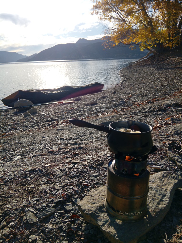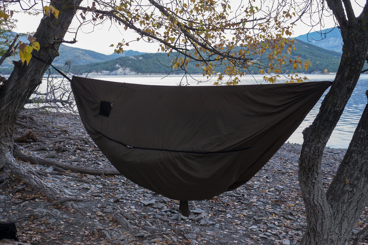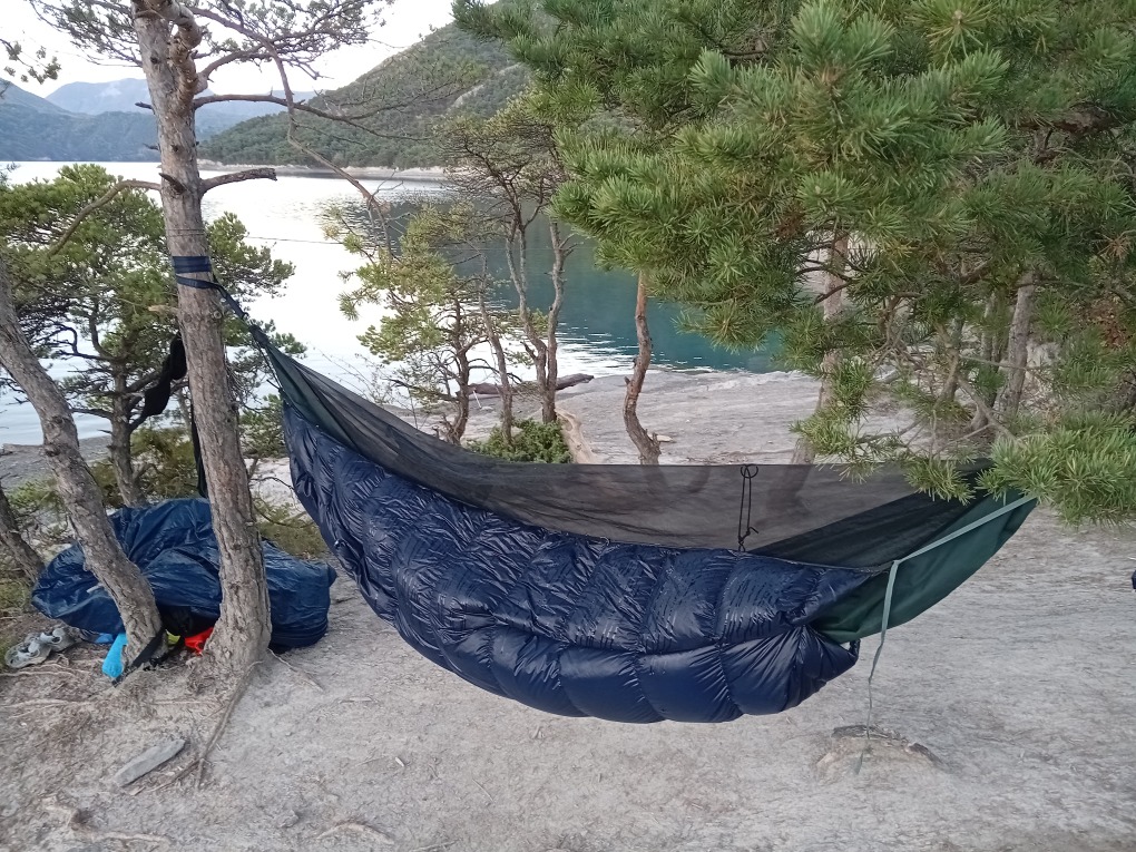 Als ich am späten Nachmittag an eine paradiesische Halbinsel komme, beschliesse ich dort die Nacht zu verbringen. Es gibt einen guten Hängeplatz, auf beiden Seiten der HM sehe ich den See, Platz für die Wäscheleine zum trocknen der Bettzeugs ist auch und am Ufer kann ich gut kochen. Nach der Nässe der letzten Nacht und weil es etwas windig ist ringe ich mich durch mein Bett besser zu schützen und probiere die windsock von onewind. Das wars dann mit der schönen Aussicht aus der Matte aber dafür ist nur die Windsocke nass, die Daunenquilts sind fast trocken.