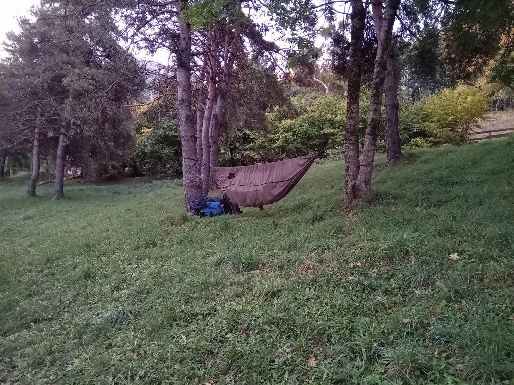 Zwei passende und stabile Bäumchen habe ich gefunden, mit Aussicht in alle Richtungen und ich will mal wieder die Sterne sehen. Also nehme ich weder die Windsocke noch das Tarp. Es ist ja die letzte Nacht, egal, wenn das Zeug jetzt nass wird.