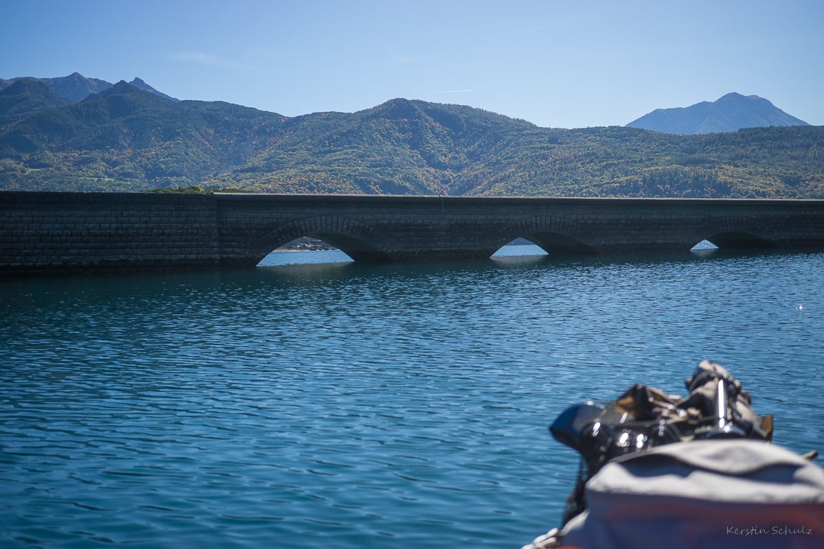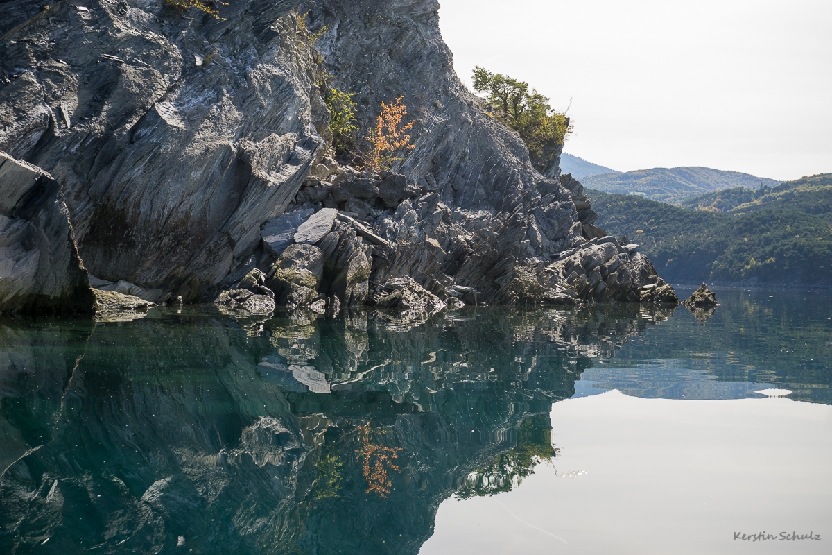 Dafür sind die Felsformationen umso beeindruckender. So fahre ich stundenlang gemütlich, freue mich an dieser Schönheit und mache Fotos. Dann muss ich wieder aufs andere Ufer, an der Staumauer entlang, der man sich nicht zu sehr nähern darf.