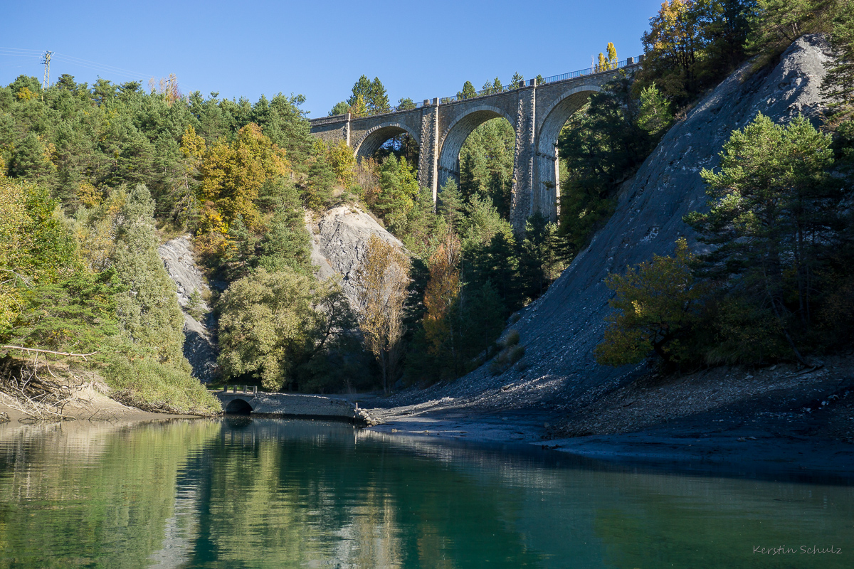 Eine lange Brücke, derselben stillgelegten Strecke führt in den See. Das Wasser ist sehr klar und ich paddel über dieser Brücke und sehe sie unter mir in der Tiefe verschwinden. Weil der Wasserstand aber gerade abgesenkt wird, jeden Abend habe ich das Boot gerade so auf den Strand gezogen, jeden Morgen lag es völlig auf dem Trockenen, sind einige Bögen der Brücke oberhalb der Wasserlinie und ich fahre hindurch bis ich mir fast den Kopf stosse.