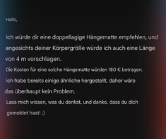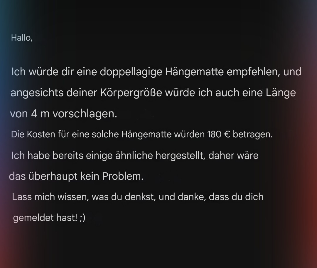 Warte aktuell noch auf eine Antwort zu ein paar Fragen, aber bisher fühlt sich das alles ziemlich gut an. Und selbst wenn nicht: Immerhin hätte ich dann eine Ausrede, warum ich noch eine Hängematte brauche.