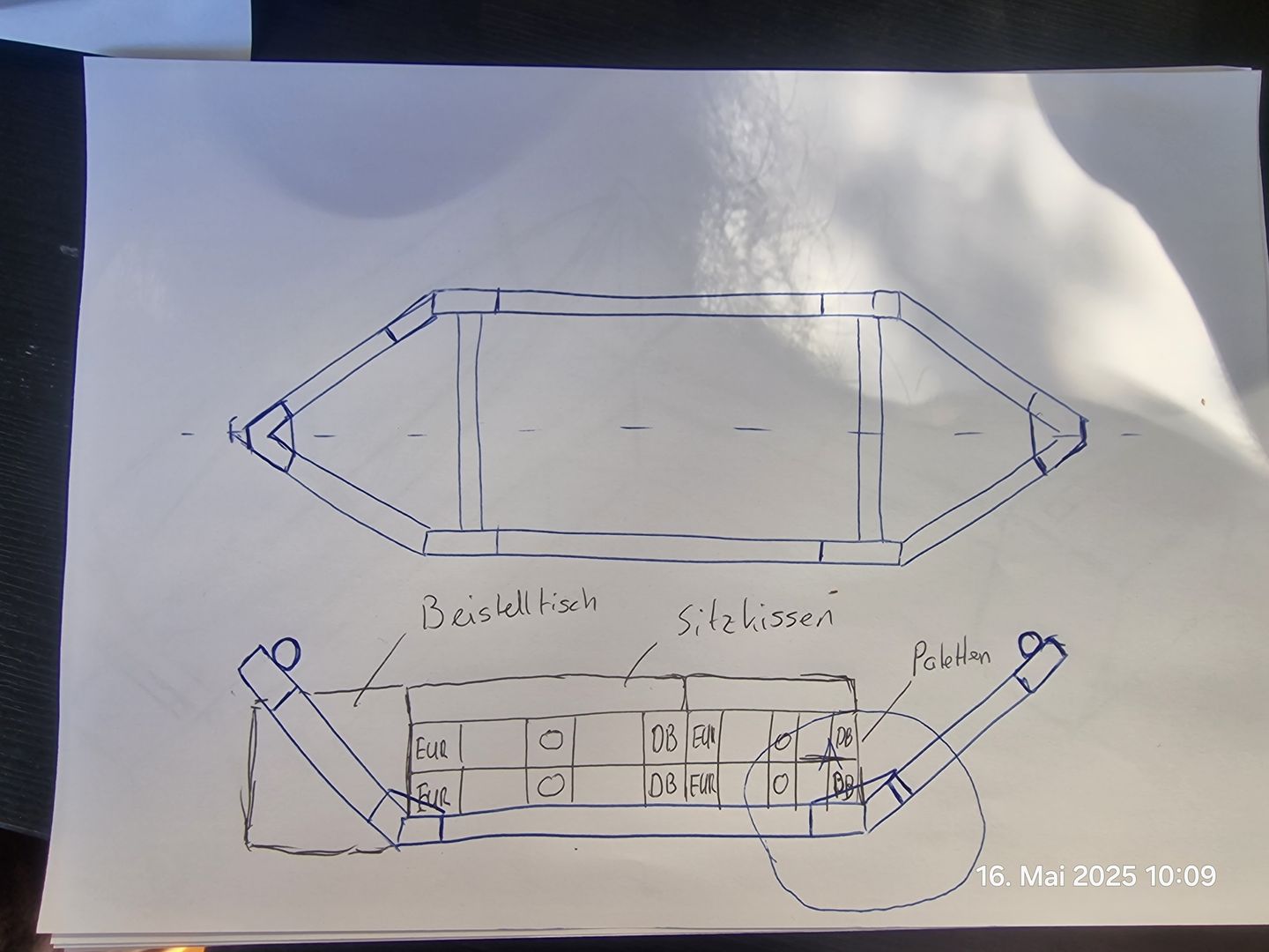 Die Basis des Ganzen sollen Europlatten sein, ergibt also eine Sitzfläche von ca. 2x 240x80 cm. Reicht für ein bisschen Hinfläzen und notfalls auch für Schwiegermama.