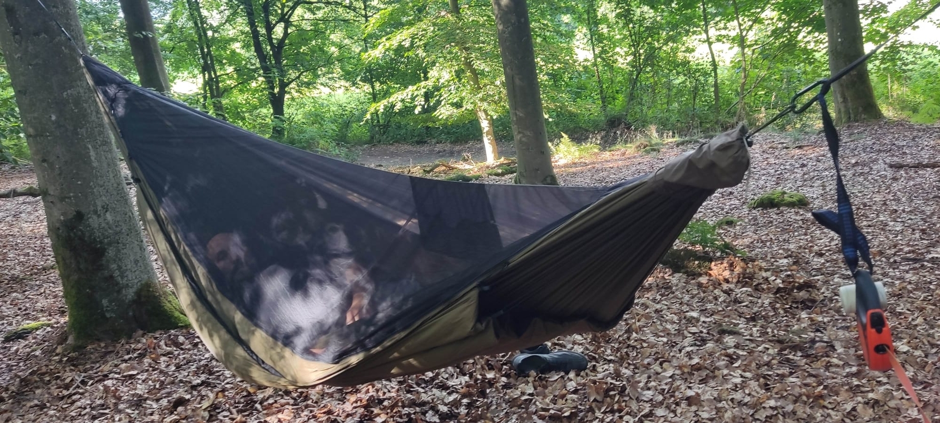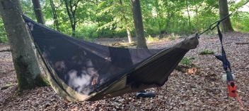 Ich würd die einfach übers Fußende zwischen Tarp und Hängematte hängen. So baumelt mein Gerödel nachts griffbereit über den Füßen rum, ohne mir im Weg zu sein oder mich im Schlaf zu erdrücken.