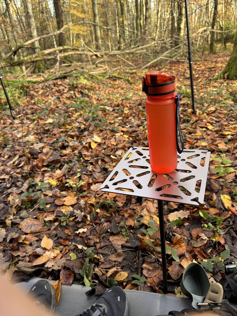 Bushbox mit Trangia Brenner dazu ein Tarp aufgespannt (nicht das ich auch ein Dach hätte und eine schöne Terrasse) zwei Stühle und den Stecktisch (immer noch keine schwarze Biene) und dann Teewasser gekocht - nix großes aber lustig mit meinem großen Sohnemann.