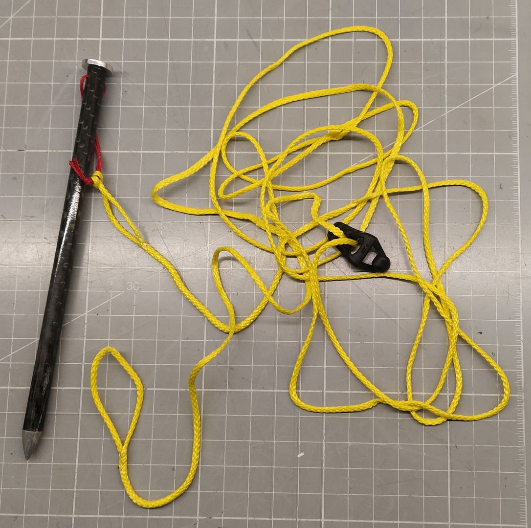 Meine letzte Obsession gilt allerdings dem "plastikteillosen Anspannen ohne Knoten zu schnüren" mit Prusikknoten aus 1.5mm Dyneema Loops! Ich nutze sie ganz wie die Leinenspanner auf der Tarp-Seite und kann damit die gesamte Länge der Abspannleinen nutzen. Ein Zweiter Prusick am Leinenende erlaubt natürlich ein beidseitiges einstellen (was einem bei Porchmode und Groundsetup das Leben erleichtern kann). Als Haken dient ein Mini-Karabiner, der zwar nicht UL ist, aber dadurch die Leinen vielseitig verwendbar und erweiterbar macht. Am Stake habe ich entweder eine feste Verbindung mit dem Hering oder einen weiteren Mini Karabiner, by the way.