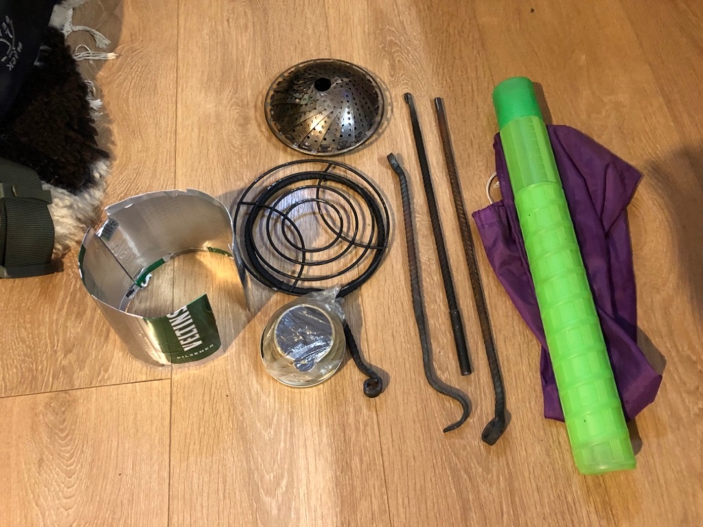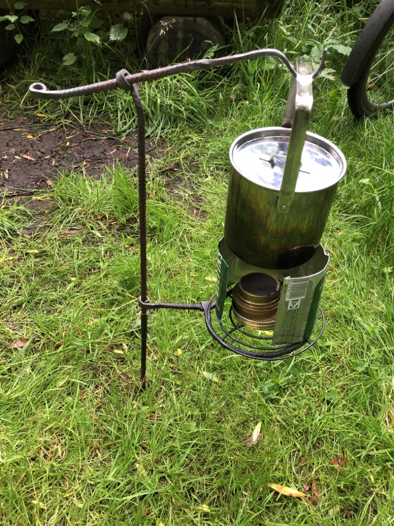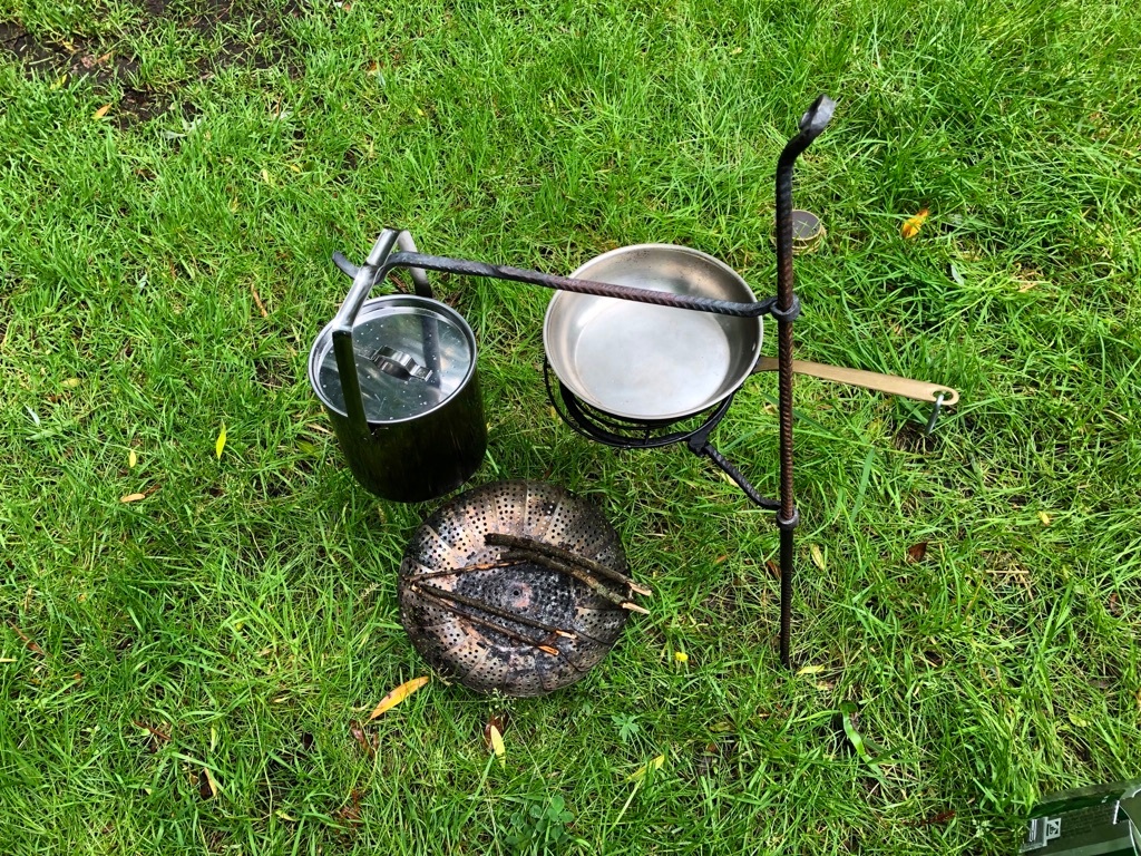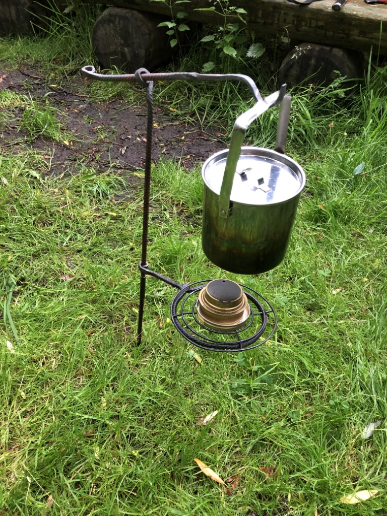 Ich kann wahlweise über Feuer oder Spiritusbrenner kochen. Mit Grillkohle in der Feuerschale kann auch ganz gut gegrillt werden.
