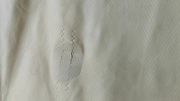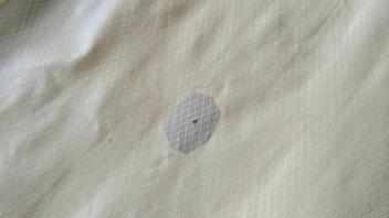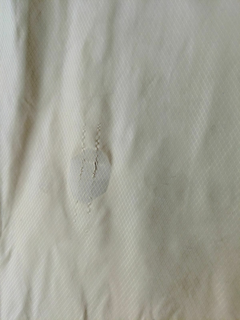Die Farben des Stoffes sind erkennbar ausgebleicht, aber er ist trotzdem noch in einem optisch und haptisch sehr guten Zustand. Ein kleines Funkenflugloch und zwei Mini-Laufmaschen hab ich Anfang dieses Jahres mit Reparaturtape fixiert. Das Whipping hat keine offensichtlichen Spuren am Stoff hinterlassen. Ich bin mir recht sicher, dass das Ding noch einige Zeit durchgehalten hätte.