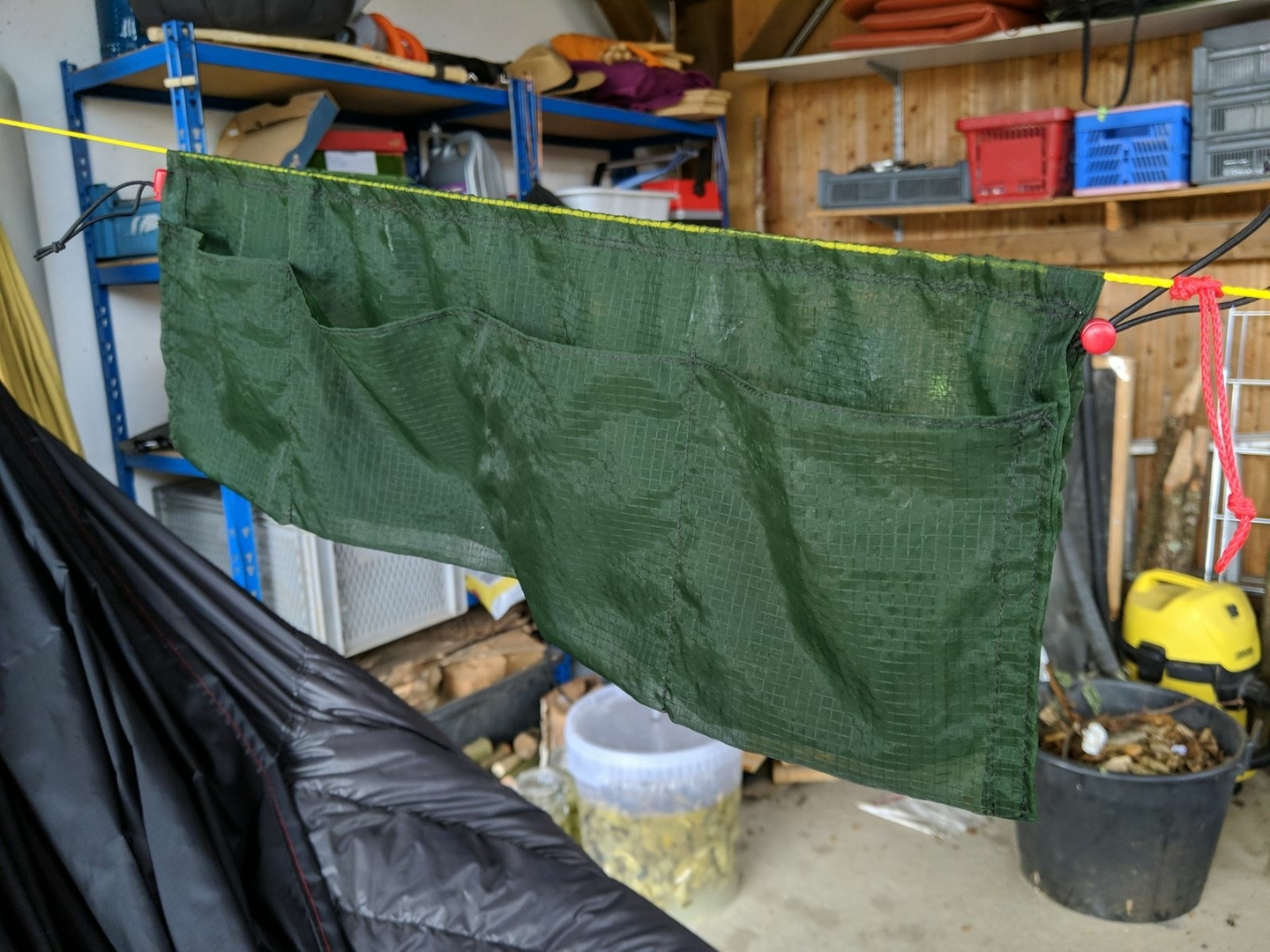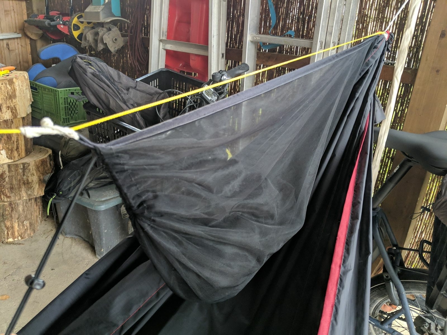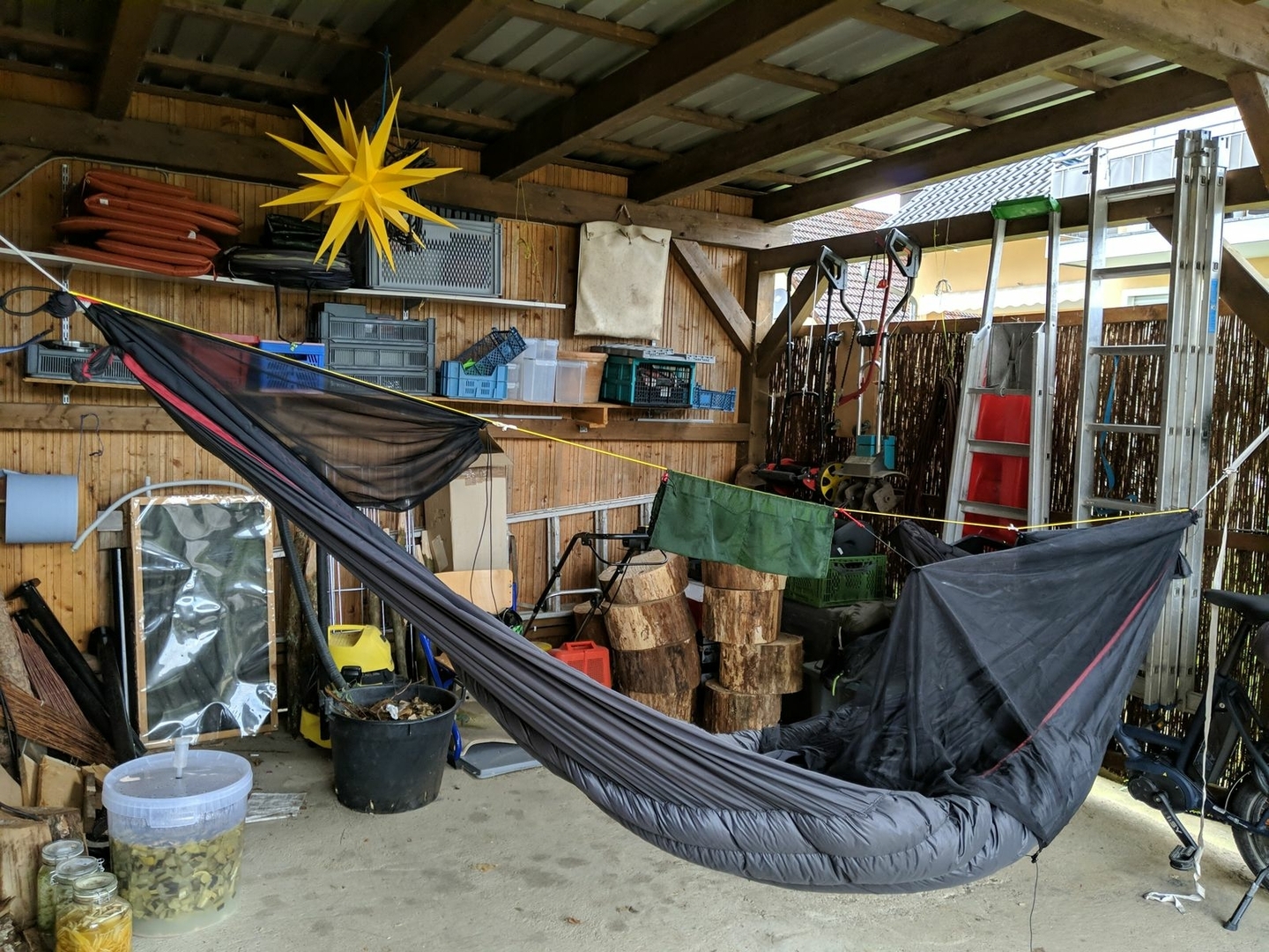 Hier noch ein paar Bilder (nicht irritieren lassen, auf da hängt teilweise noch mein auch schwarzer Underquilt drunter):