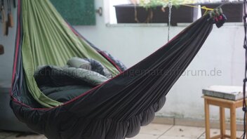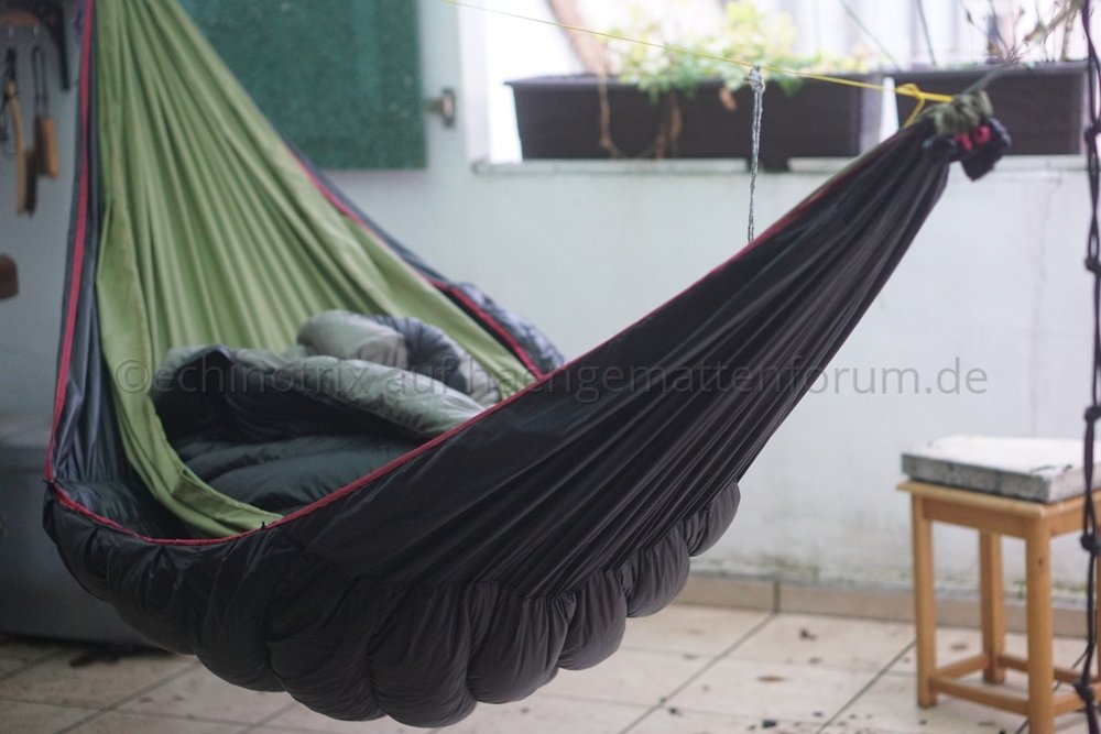 Vielleicht muss ich in der klassischen Hängematte mal versuchen, die Ränder des Quilts nicht zwischen Körper und Hängematte nach unten zu ziehen, sondern den Quilt nur lose über mich zu legen. Vielleicht ist genau das der Fehler.