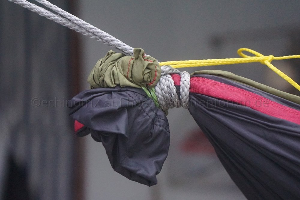 Zuerst habe ich HM und Wooki auf exakt die gleiche Länge gebracht, jeweils mit Tunneln an den Enden. Dann habe ich an einem Ende von HM und UQ zwei idetnische Loops durch die Tunnel gezogen und beide Teile an einem Haken aufgehängt. Dadurch wurden HM und Wooki ganau aneinander ausgerichtet, sowohl bezüglich Position als auch bezüglich der leichten Rundung. Dann habe ich im Grunde ein Standard-Warbonnet-Whipping durch den Tunnel der HM gemacht, nur habe ich den Stoff des Underquilts mit eingeschnürt. Wiederholung am anderen Ende, Continuous Loops drum rum, fertig.