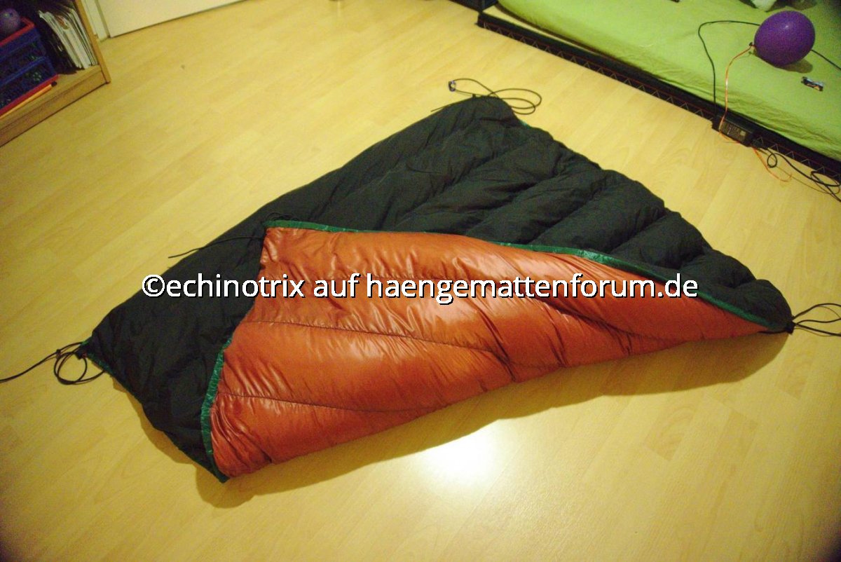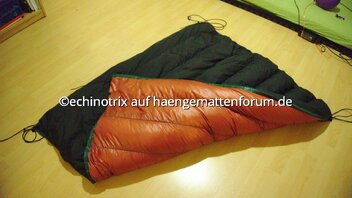 Sowieso hätte ich mir im Nachhinein besser einen echten 3-season-quilt gemacht (4-5 cm Loft) und einen full-size für den Winter. Der erste Test hat gezeigt, dass ich bei knackigen minusgraden wohl auch mit guter Waden- und Fuüßisolierung wohl an den Beinen frieren werde, und - noch schlimmer - die Nächte über damit beschäftigt sein werde, zu verhindern, dass mir kalte Luft Richtung hintern strömt.