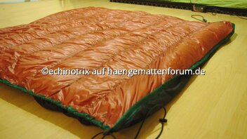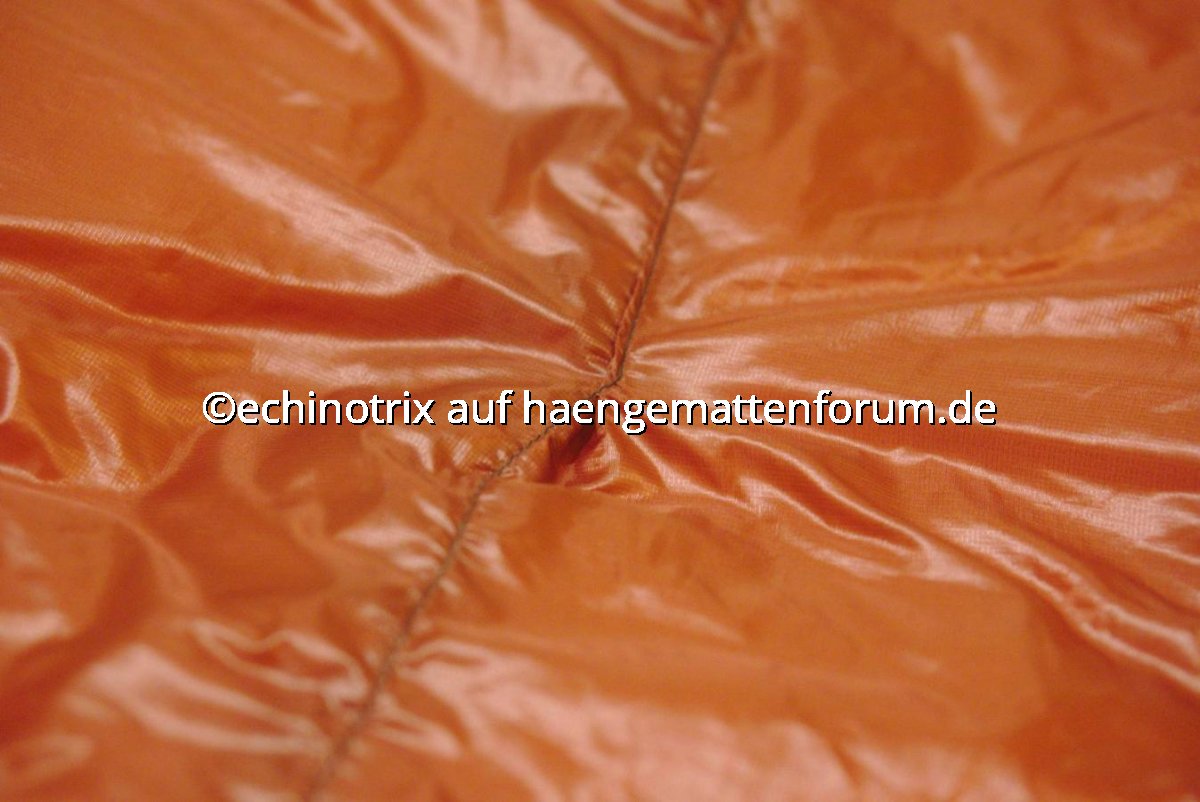 Der Außenstoff ist nach den Regeln der Kunst etwas größer als der innen, was verhindert, dass die Daune zu stark komprimiert wird, wenn der Quilt sich um die Hängematte legt (differential cut heisst das, oder? Hammock Fairy)