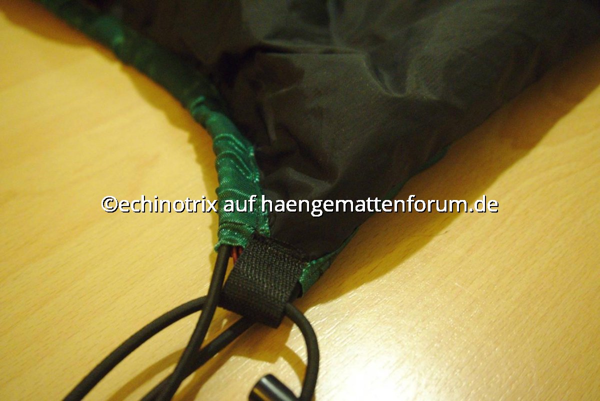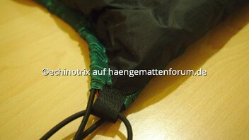 - Aufhängung: Ein Gummiseil an jeder Längskante, zu einer Schlaufe an der Ecke zurückgeführt, mit Korddelstopper gesichert; ein gummiseil an jeder Querkante, an einer Seite angenäht, an der anderen mit Kordeltopper gesichtert (insgesamt etwa 10 m Gummiseil, etwa 5 Euro; 6 Kordelstopper, etwa 5 Euro)